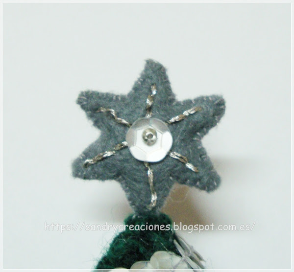 Finalmente solo nos quedaría confeccionar la estrella con fieltro a la que le cosí unos detallitos con hilo plateado y con una lentejuela también plateada.