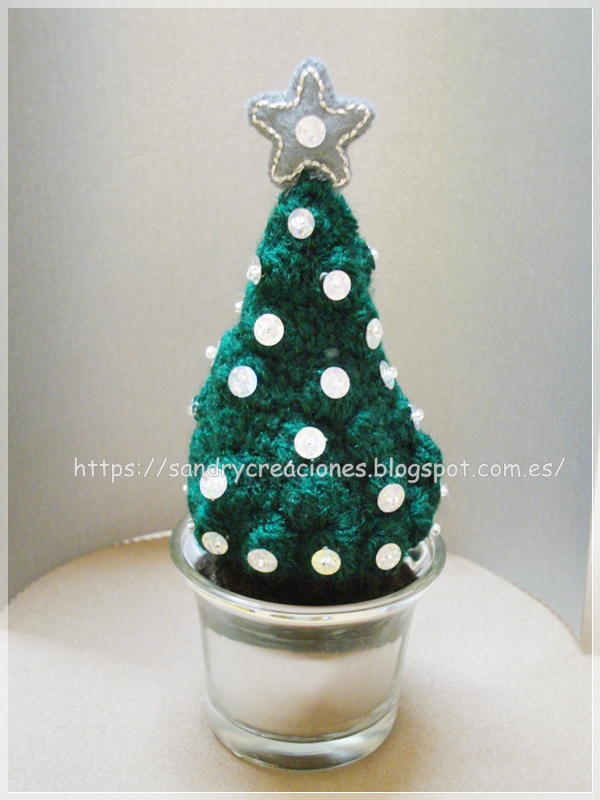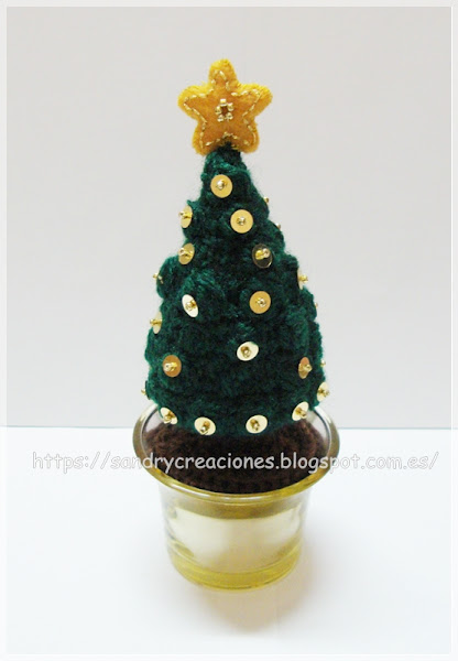 Ahora solo nos quedaría unir esta parte que hemos tejido al tronco del árbol y ponerlo dentro del recipiente que hemos elegido para ponerlo. En mi caso como ya os dije es un portavelas pequeñito que encontré en dorado y plateado.