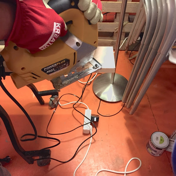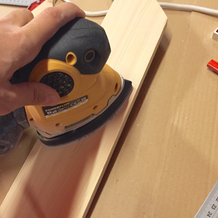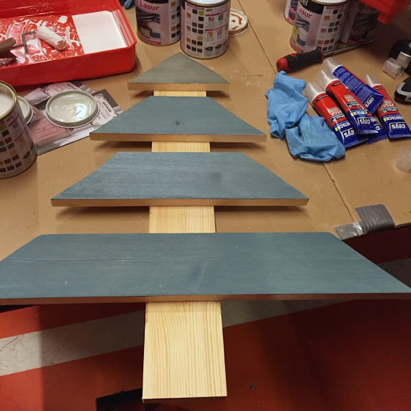 Para realizar el arbolito cortamos las tablas de madera con sierra de calar y las pegamos.