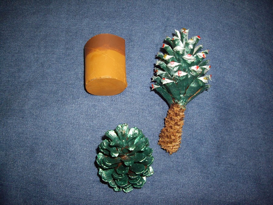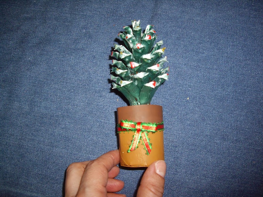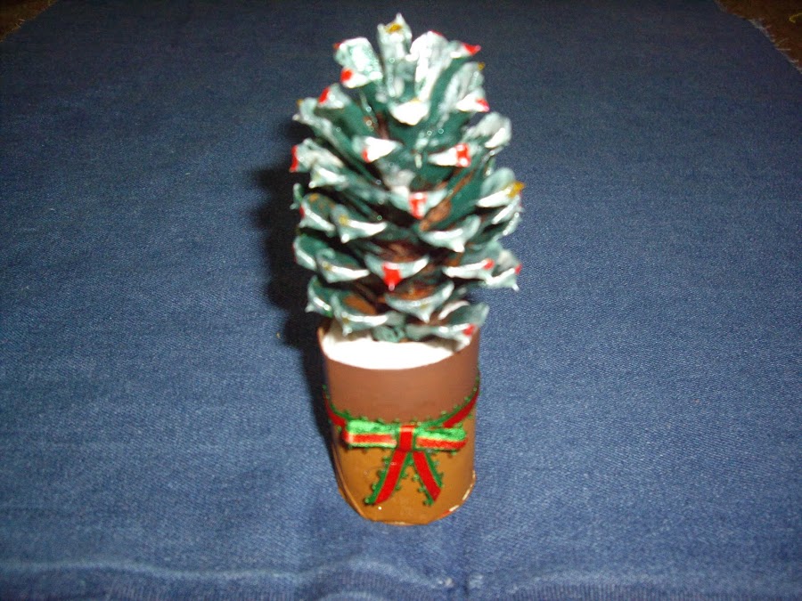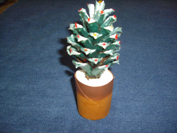 Este es mi arbolito de material reciclado. Lo realice con un rollo de papel higienico, una piña, servilleta, cinta y un poco de pintura.