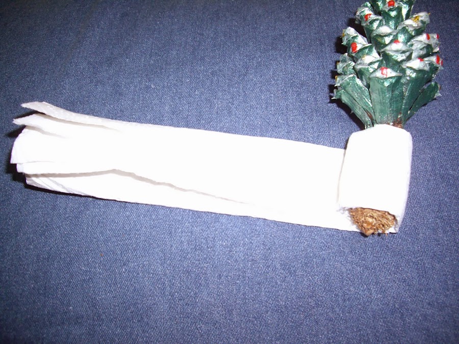 Luego tome una servilleta y la doble por la mitad, nuevamente por la mitad hasta tener la altura de mi maceta. Esa servilleta hay que envolverla a el tallo de la piña, si es que encontraron una con tallo, o colorarla directamente dentro de la macetita, y sobre esta pegar la piña con silicon caliente. En el caso que tengan como yo la piña con tallo, al envolverle la servilleta y colocarla dentro de la macetita ya no necesitamos pegamento.