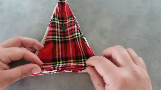 Ahora damos la vuelta, en la base hacemos un pequeño doblez hacia adentro y planchamos, y nos va a quedar de esta manera: