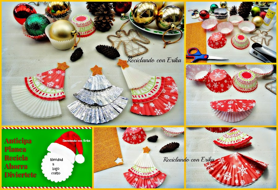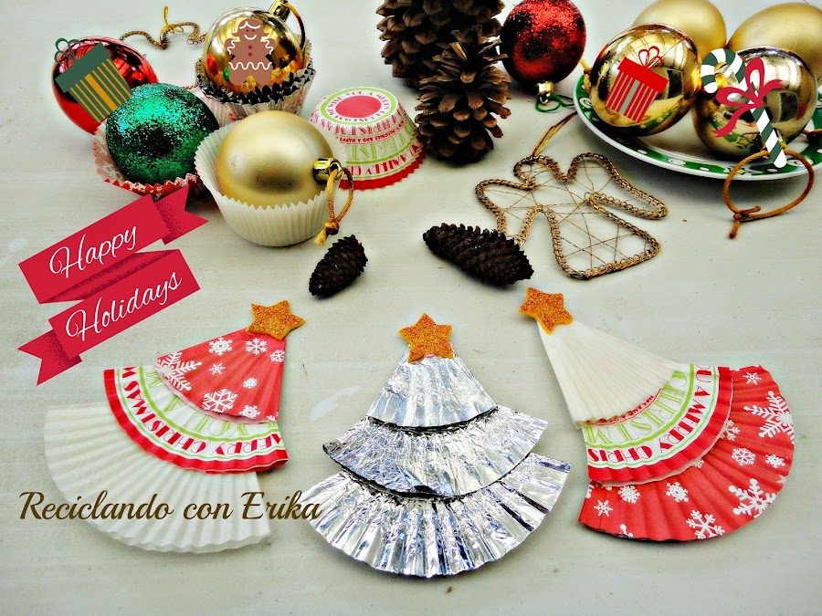si te gusta hornear o tienes amigas que lo hacen de pronto hay en tu cocina " papelitos para hacer cup cakes " te voy a enseñar como hacer unos lindos y divertidos árbolitos navideños , para decorar , hacer guirnaldas , decorar gabinetes de cocina o el refrigerador .