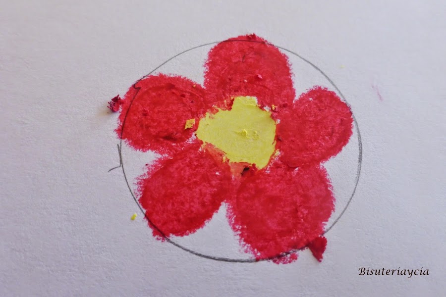 Lo siguiente que hice fue dibujar con el mismo corta pastas la circunferencia en un trozo de papel y pinte una flor en el interior con ceras.