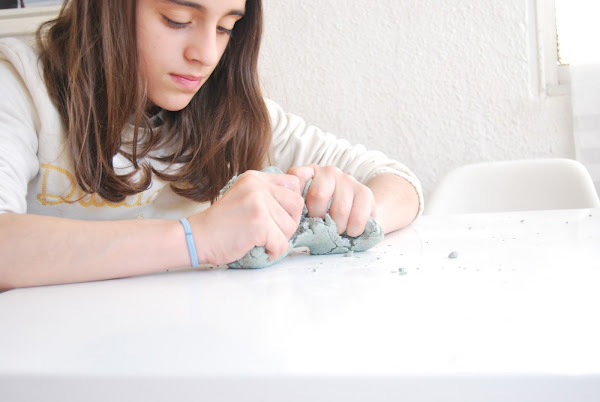 Lo curioso, además, es que en realidad la idea era preparar slime (el antiguo blandiblú de cuando éramos pequeños), pero algo hicimos mal y nos ha salido arena, que en realidad, a mí, me gusta mucho mas (el blandiblú me sigue dando asquillo...). En fin, a veces los errores salen bien :-)