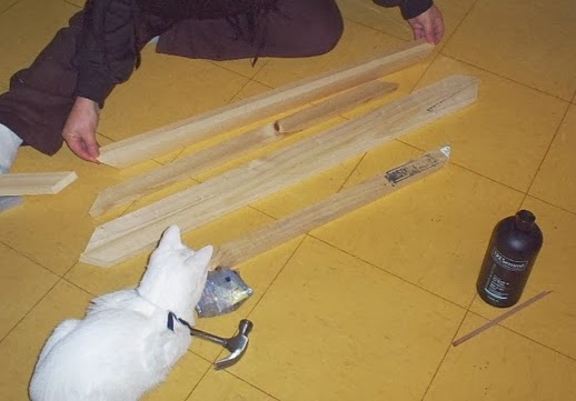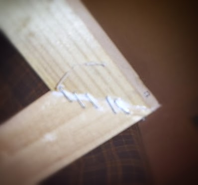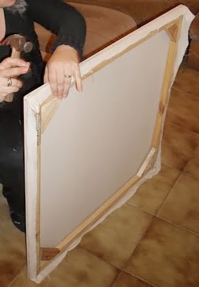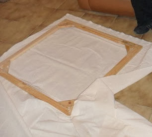 Colocar un lateral hace firme al bastidor. Lo cruzamos en las esquinas siendo cuidadosos de que no sobresalga del lado en que ira la tela. Es preferible que sobresalga del lado trasero del bastidor. En cuadros muy grandes, largos o muy anchos es aconsejable colocar varillas que lo atraviesen en esos sentidos, tomando las mismas precauciones.