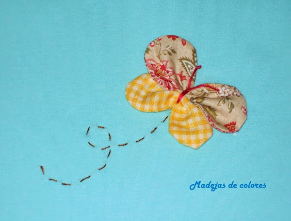 Pero el que la sigue la consigue y esto fue lo que se me ocurrió, una linda mariposa, que colocada estratégicamente sobre las manchas y dibujando la estela que deja en el vuelo, quedó bastante centrada, sobre la camiseta.