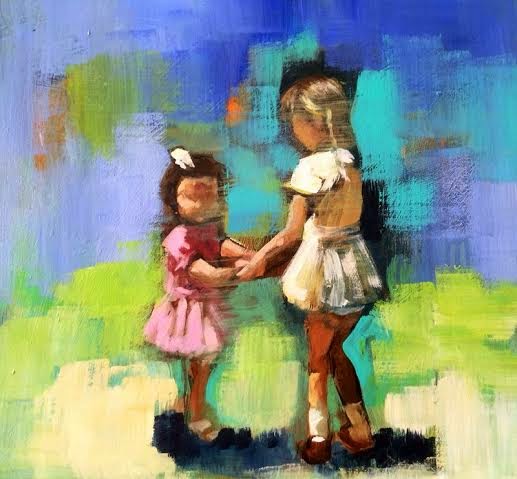Es una imagen de nosotras dos de pequeñas, realizada en acrílicos, con una bonita paleta de tonos fríos, muy a mi gusto. Ya luce en mi salón. Graciasssssssssssss hermanita, me encantaaaaaa.