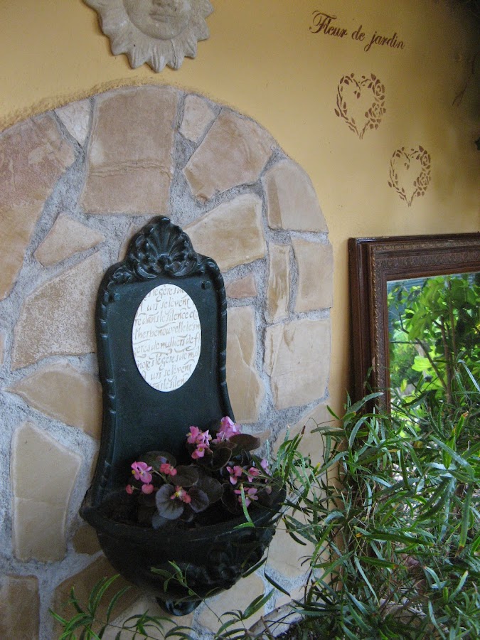 La fuente (en la pared de la izquierda)está estropeada desde hace mucho tiempo...ya me he cansado de verla fea y la he arreglado para que sea como un macetero más....el tubo que llevaba colgando lo he tapado con una plaquita de madera pegada con silicona. Unas Begonias de flor rosa.... y ya es otra cosa....