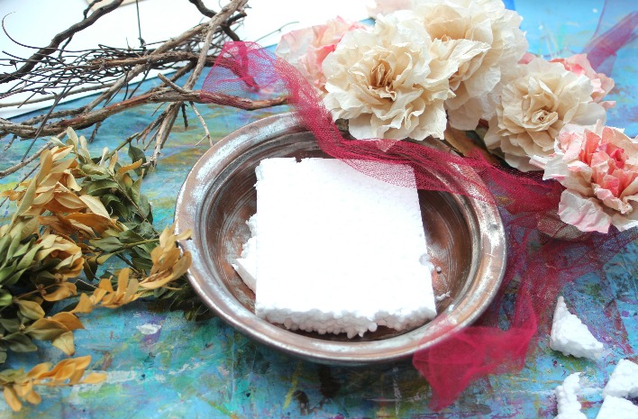Y con mis rosas tan bonitas no podía dejarlas dentro de una bolsa... sólo había que buscar qué encontraba por mi taller: un viejo plato de cobre, icopor, algunas ramitas secas de mi jardín...