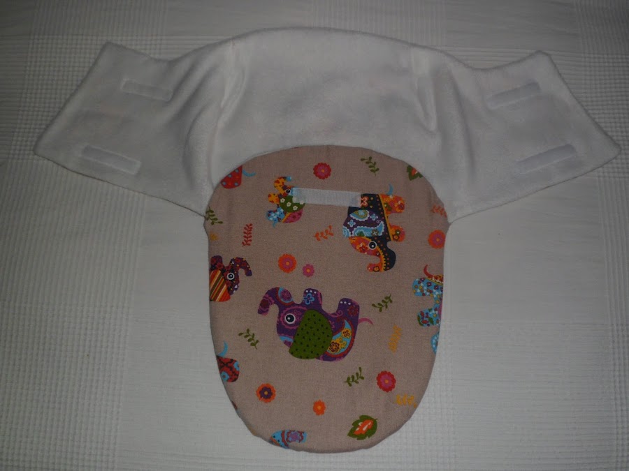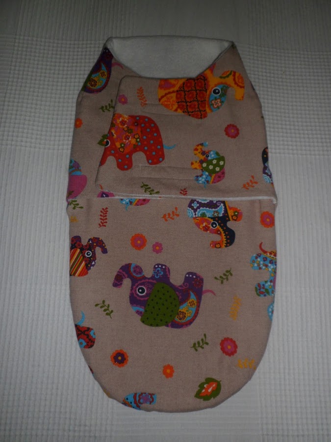 He utilizado tela de loneta con dibujos de elefantes para el exterior y forro polar blanco para el interior.