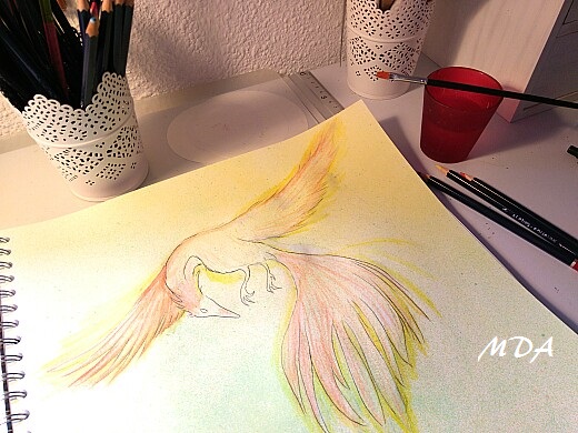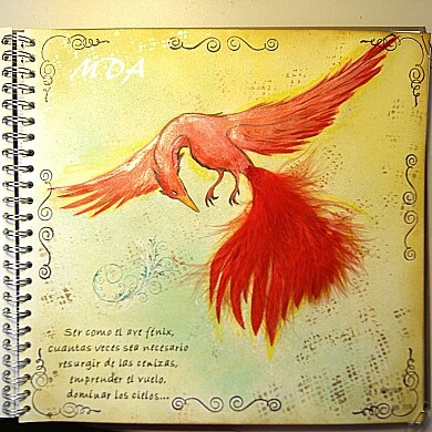 Entre los dos primeros temas propuestos he elegido el de animales mitológicos y me he decidido por un Ave Fénix en rojo brillante.