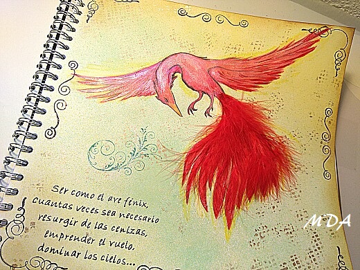 Para finalizar, estampaciones en negro, plumas... y un fragmento de un poema precioso sobre esta ave que resurge de sus cenizas.