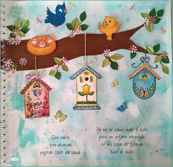 "Casas" ese era uno de los temas propuestos para "Mi cuaderno Art Journal" del grupo de facebook Creando y Compartiendo ATCs. y pensando, pensando me decidí por unas bonitas casas para pájaros colgadas de la rama de un árbol.