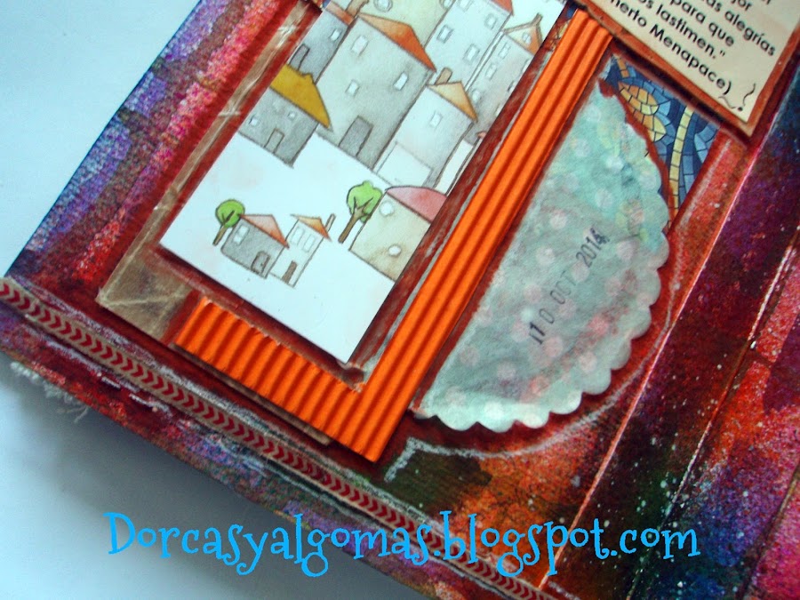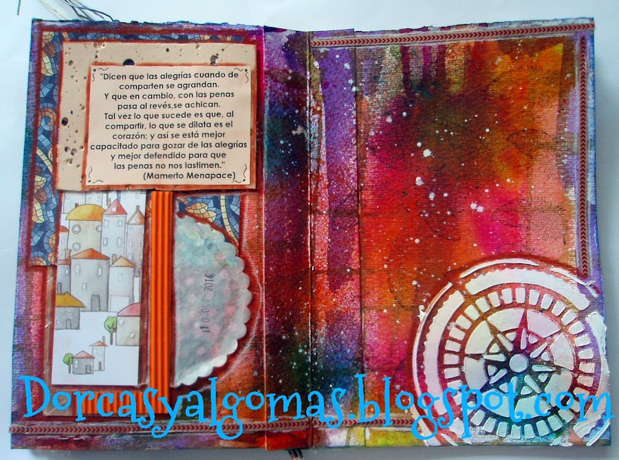 He estampado un sello de madera, de pluma con tinta negra y en la esquina inferior derecha , he hecho más relieve con una plantilla de stencil y pasta de modelar.