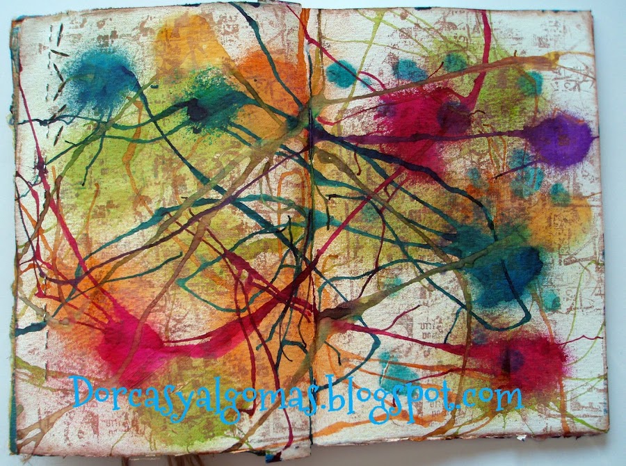 Ponemos tinta en spray de varios colores por la página y con la ayuda de un secador de pelo, proyectamos el aire sobre la tinta en spray.Lo que hace el secador es extender la tinta hacia todos los lados y crear un efecto muy bonito.