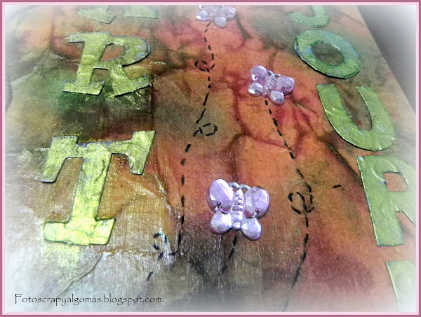 Letras en cartulina, las pase por una carpeta de embossing y la pintes de dorado con acrílicos y encima le puse polvos perfect pearls diluido con agua.