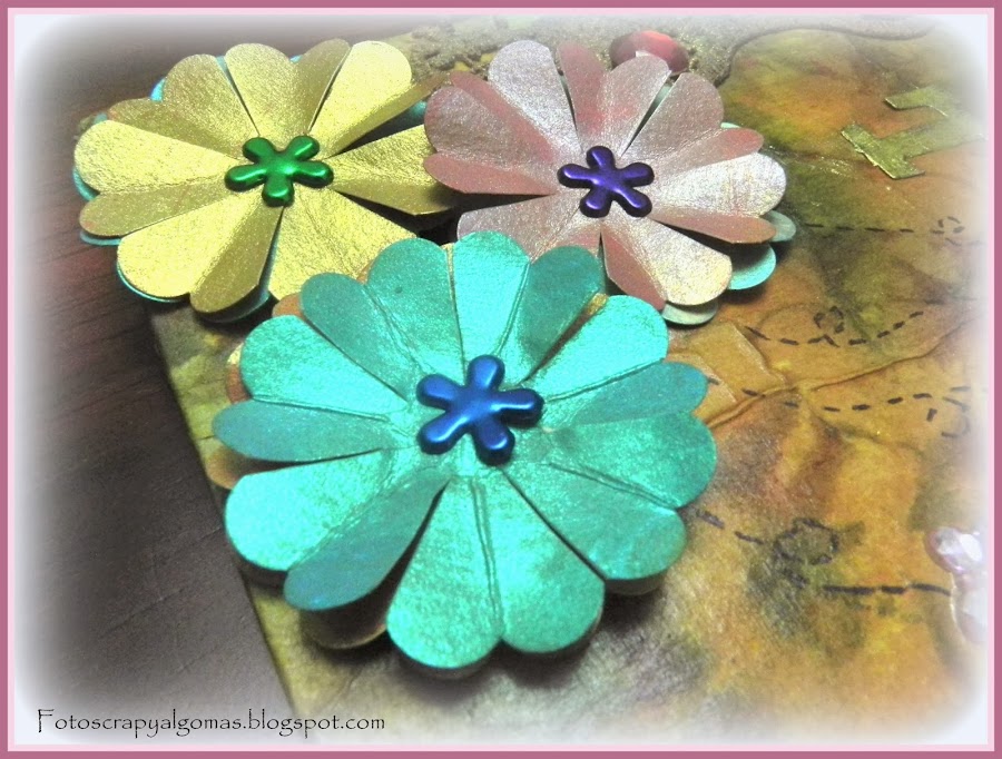 Las flores la hice con una pequeño tutorial que encontré en una publicación en face en el grupo Scrap para principiantes, no te puedo poner el enlace porque no encuentro la publicación. Están pintadas la base con pintura acrílica y la de encima con polvos perfect pearls diluida con agua, eso le da ese efecto metálico.