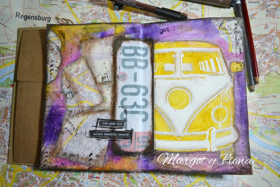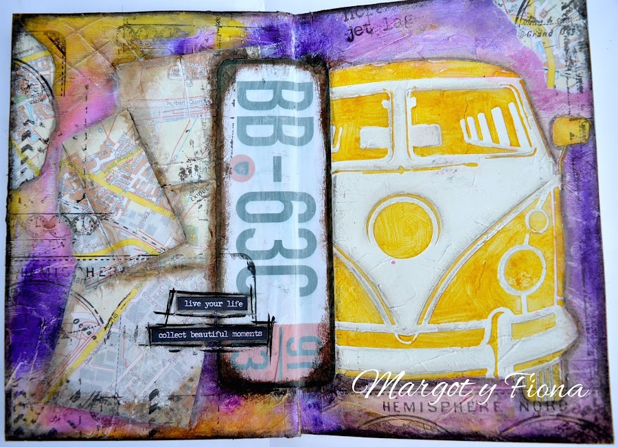 Como elemento protagonista tenemos a la flamante furgoneta amarilla hecha con mi nuevo stencil y coloreada a continuación.