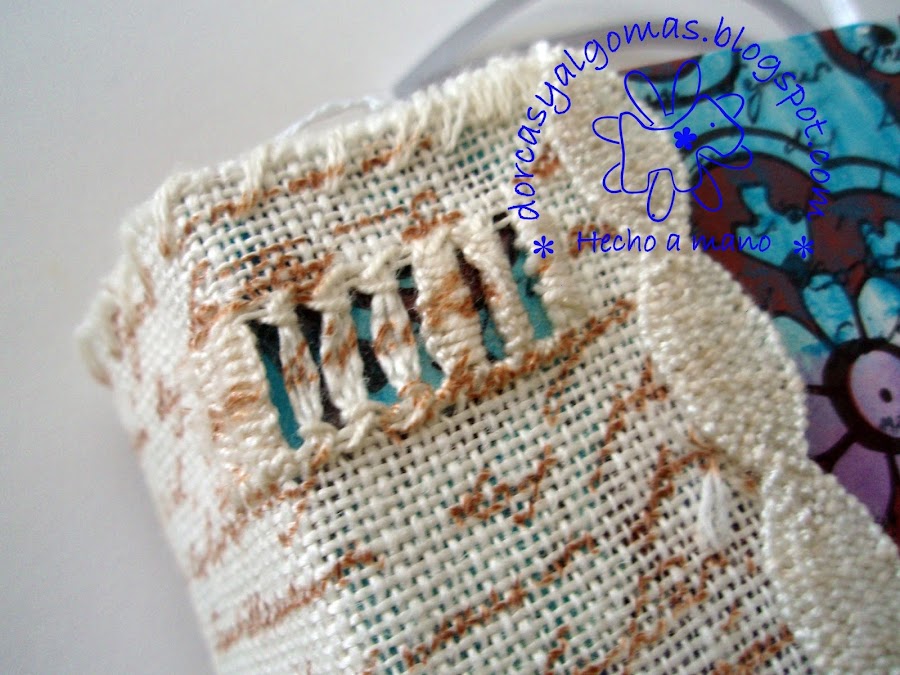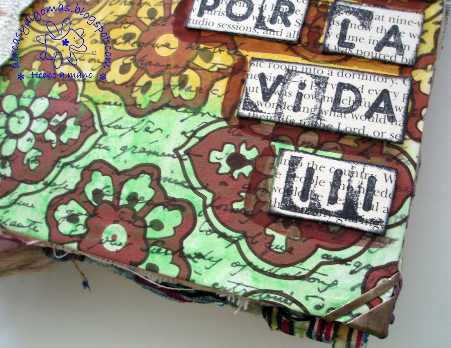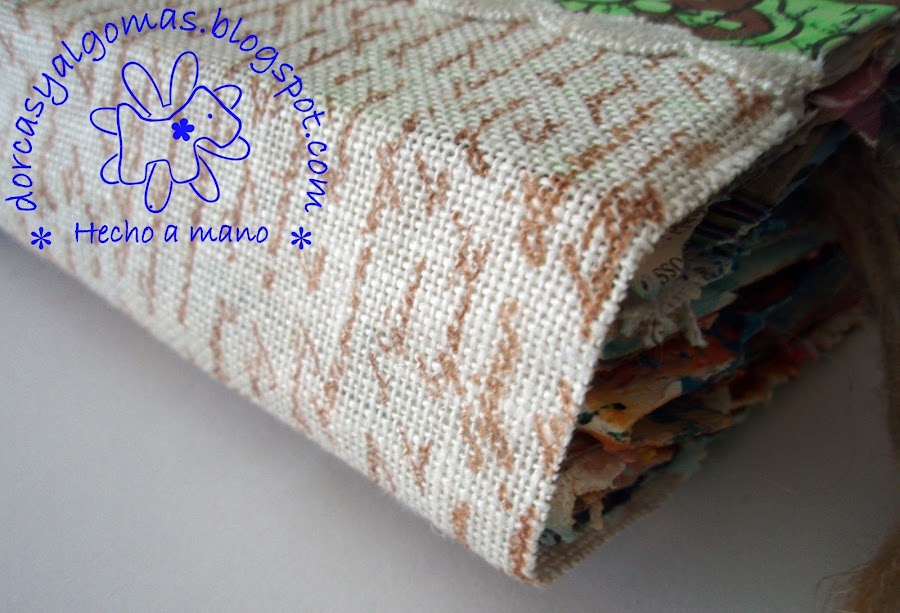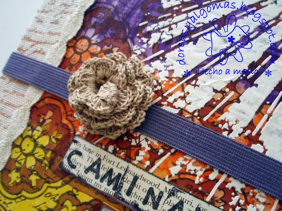 Pego las portadas sobre el álbum y pongo un pedazo de tela rústica para el lomo. En esta tela he estampado un sello de escritura. El título lo he realizado sobre una hoja de papel de libro viejo, he estampado un sello de abecedario con tinta negra. Para el cierre he utilizado una goma elástica plana de color morado, en la unión de la goma he cosido una flor de ganchillo.