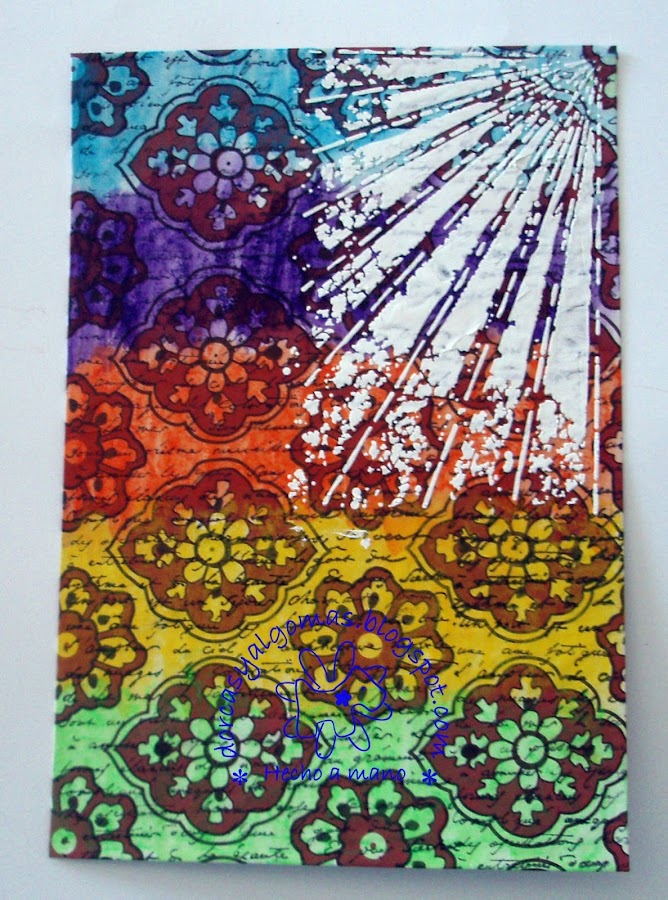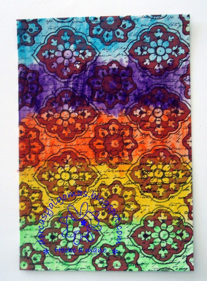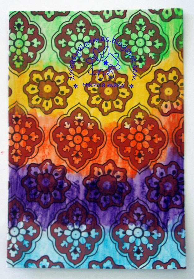 He pintado con los gelatos, pero si no tenéis podéis utilizar acuarelas. El utilizar este tipo de pinturas es para que se siga viendo el fondo decorado del papel. Si utilizamos otra pintura más cubriente, terminaríamos por cubrir todo.
