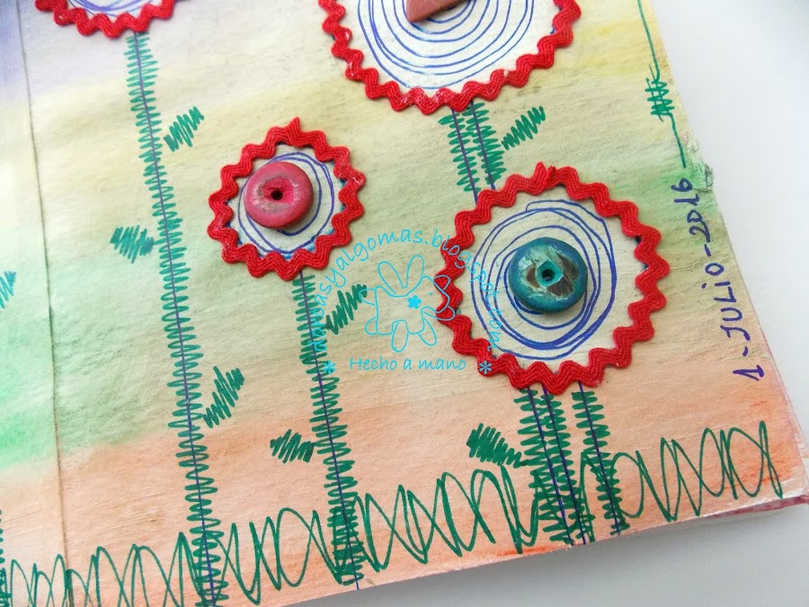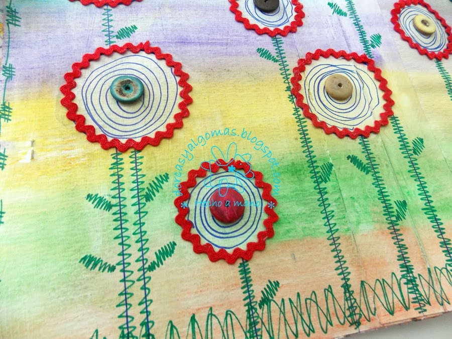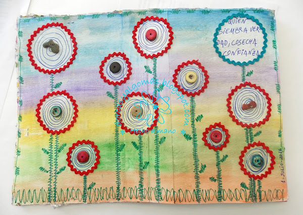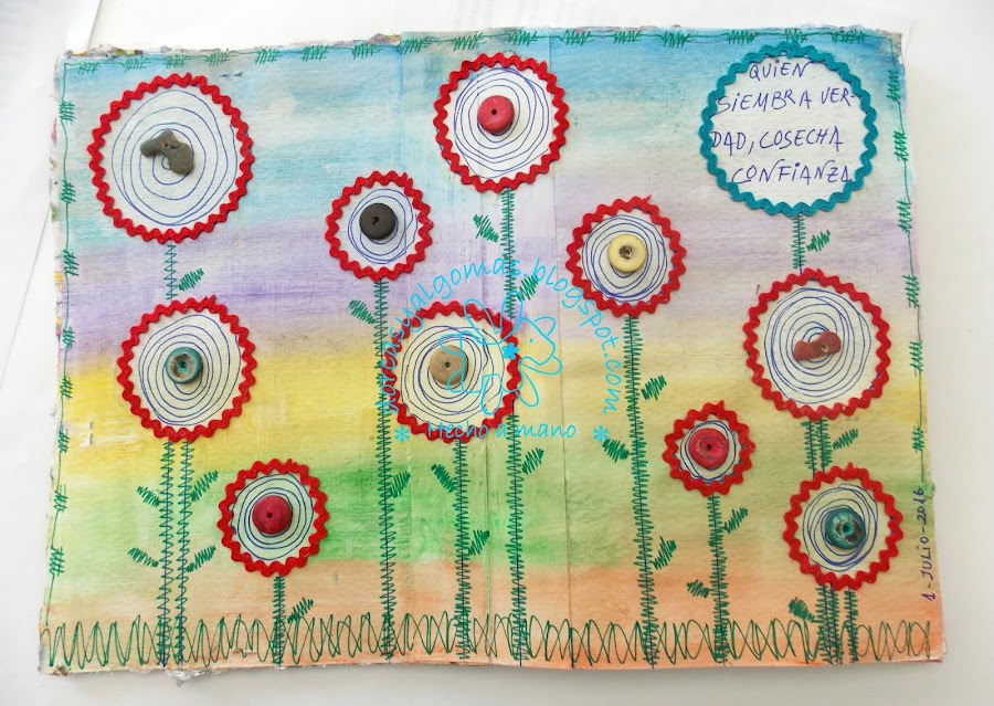 Vamos con los últimos detalles: pongo cinta zig-zag alrededor de los círculos, dibujo doodles dentro de ellos dejando uno en blanco para el texto, hago también doodles sobre las lineas verticales simulando los tallos y hojas de las flores, también hago un marco alrededor de la página."Quien siembra verdad, cosecha confianza"