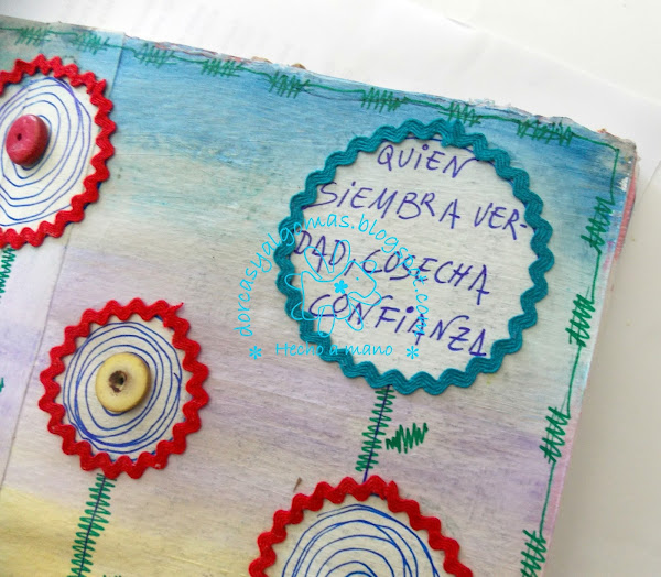 Vamos con los últimos detalles: pongo cinta zig-zag alrededor de los círculos, dibujo doodles dentro de ellos dejando uno en blanco para el texto, hago también doodles sobre las lineas verticales simulando los tallos y hojas de las flores, también hago un marco alrededor de la página."Quien siembra verdad, cosecha confianza"