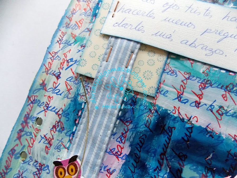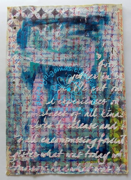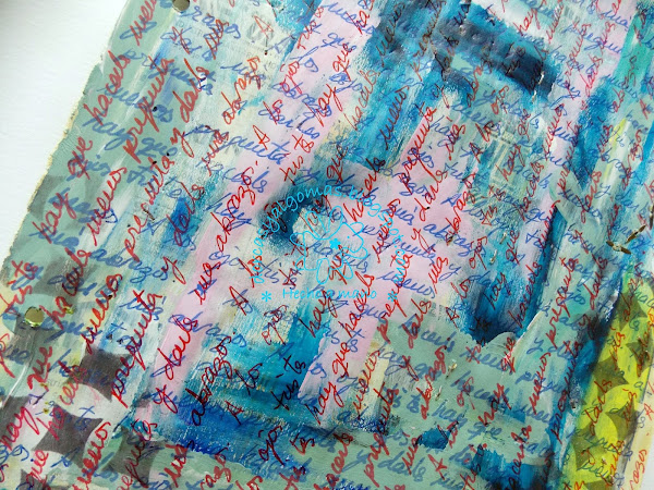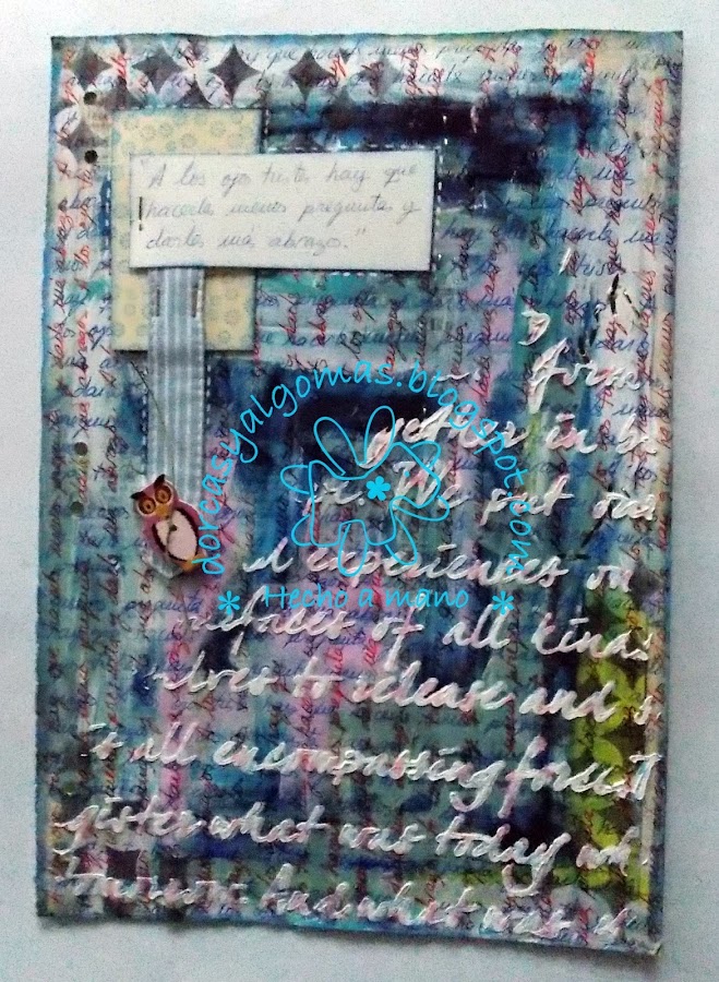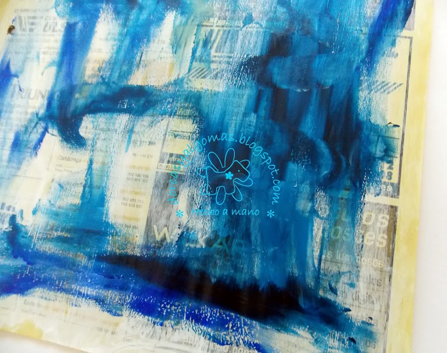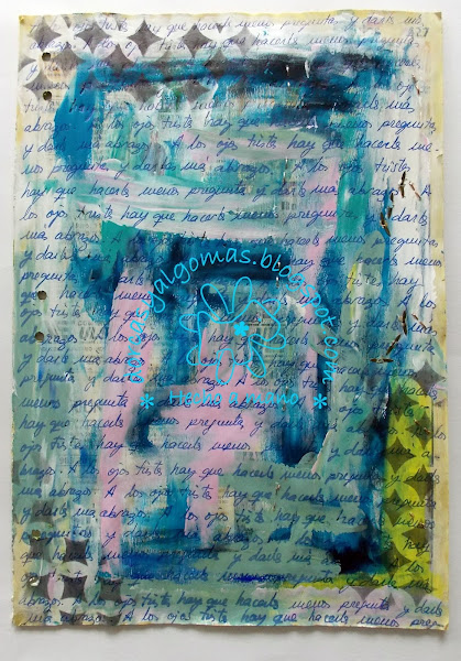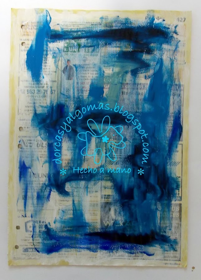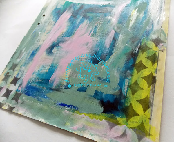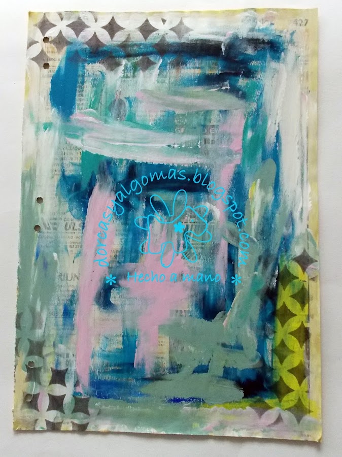 La primera capa de la página es fruto de la limpieza de los pinceles en ella. Con lo cual empiezo a trabajar sobre una gama de colores ya hecha a la cual he añadido un sellos con tinta negra: