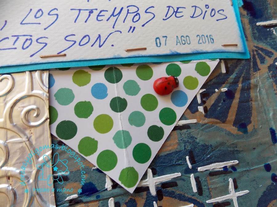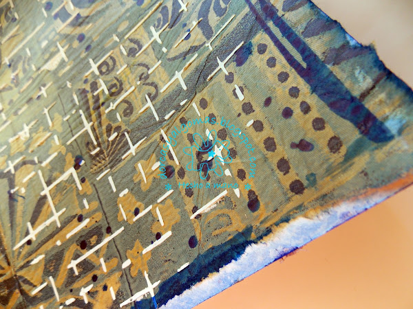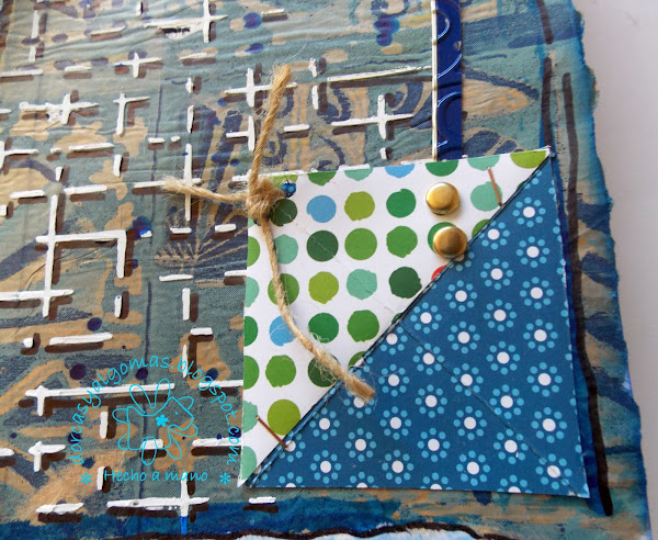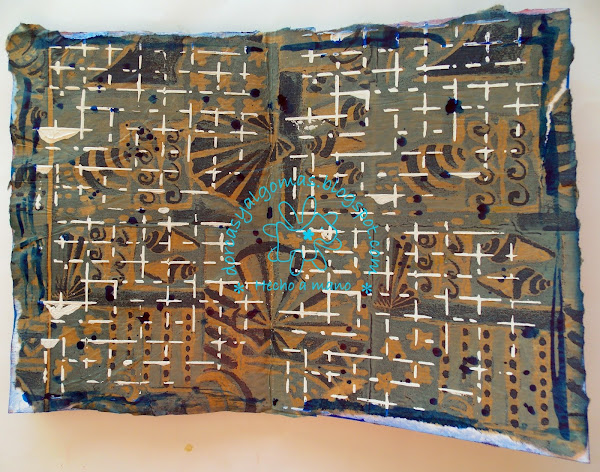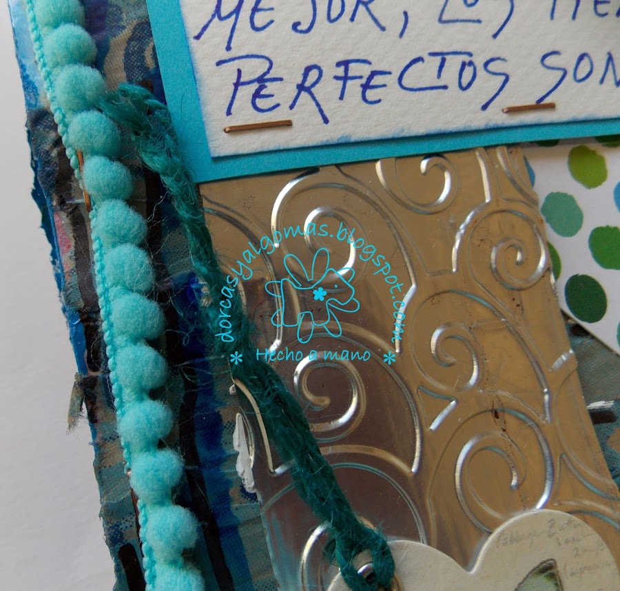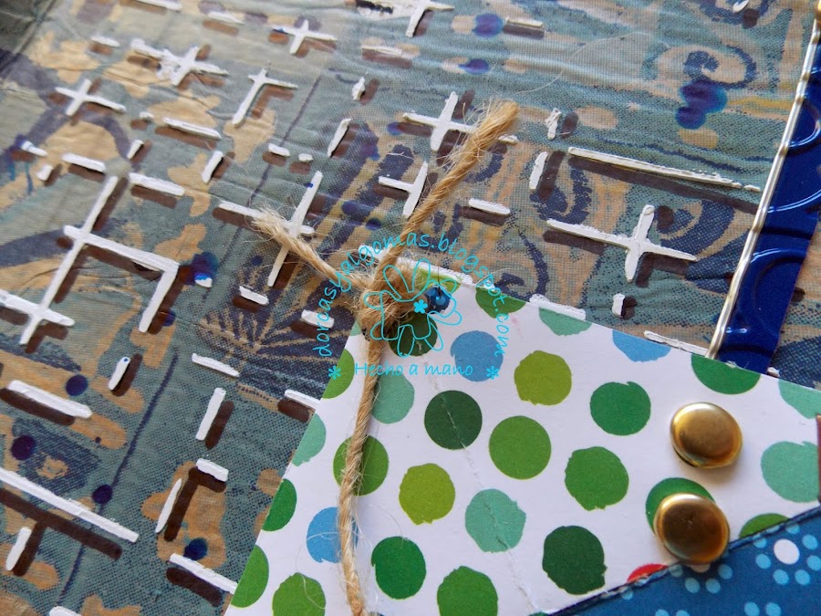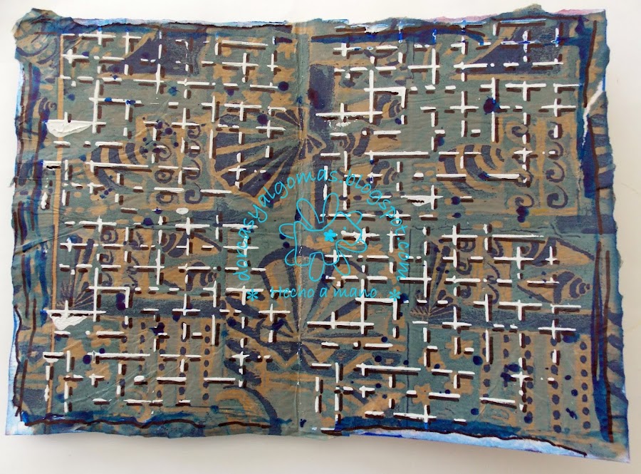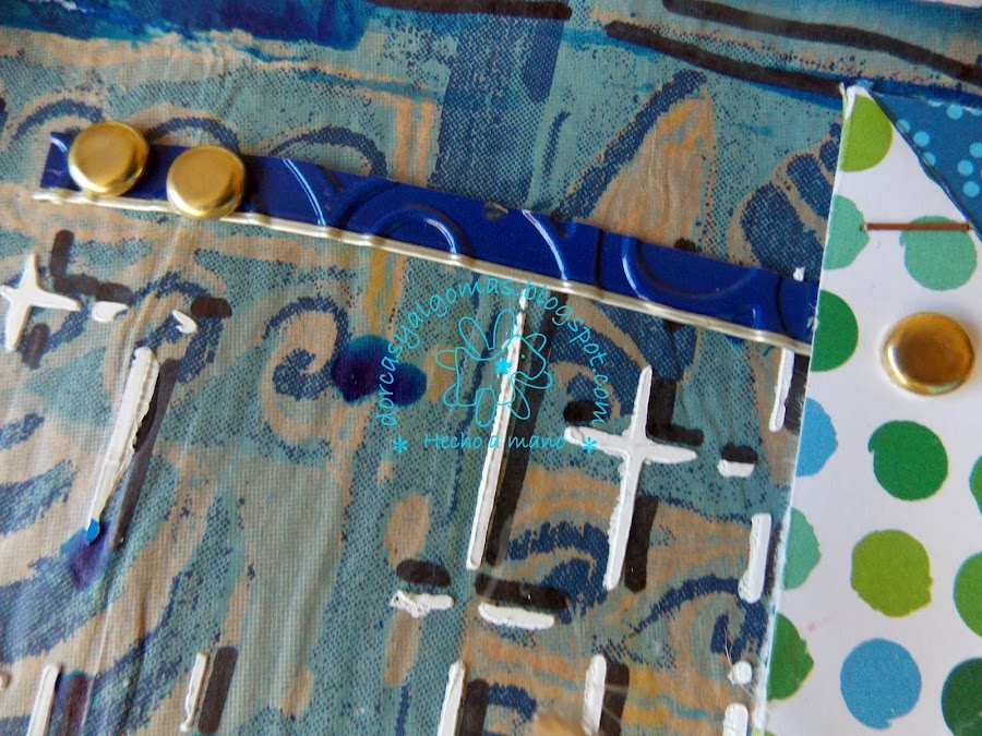 Una vez seca la pasta de modelar, con tinta china azul hago unas gotas en la página y doy unas pasadas por los bordes creando un marco.