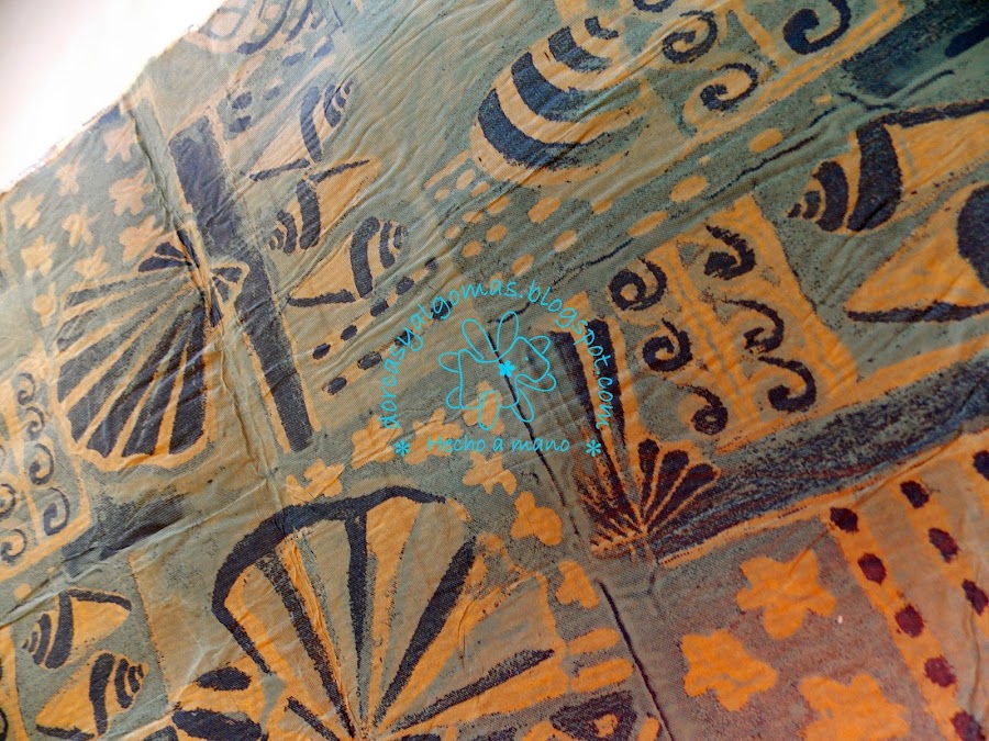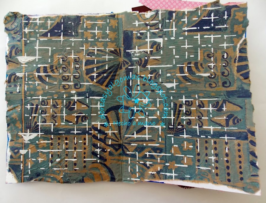 Para la primera capa he utilizado un papel de regalo en tonos azules y lo he pegado con cola blanca.