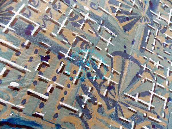 Dejo secar.A cotinuación, cojo pasta de modelar con una tarjeta y la extiendo encima de una plantilla de stencil rellenando todos los huecos, de esta forma marco la plantilla sobre la página.