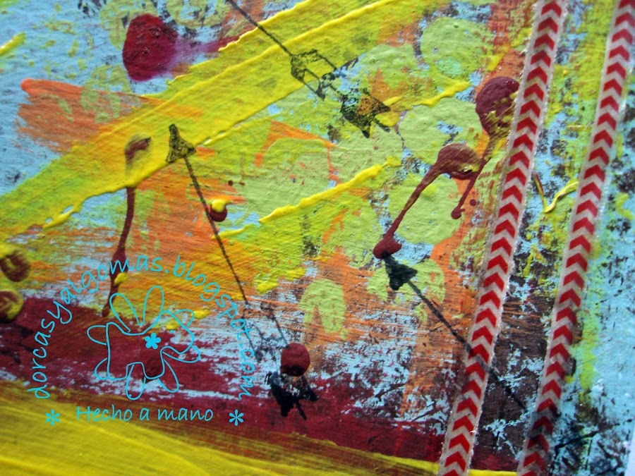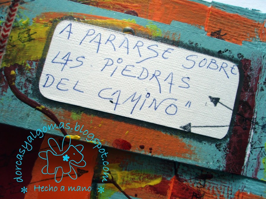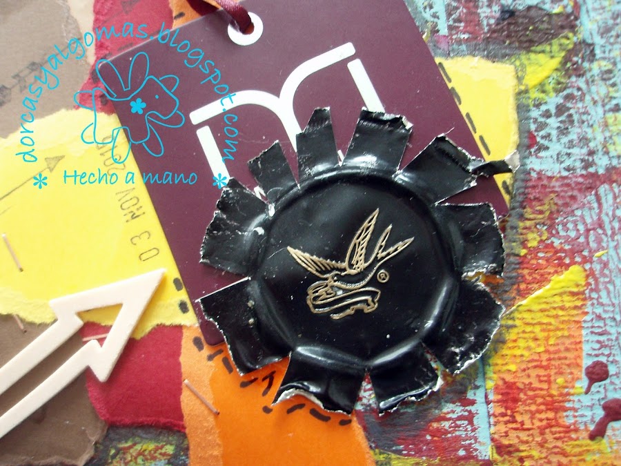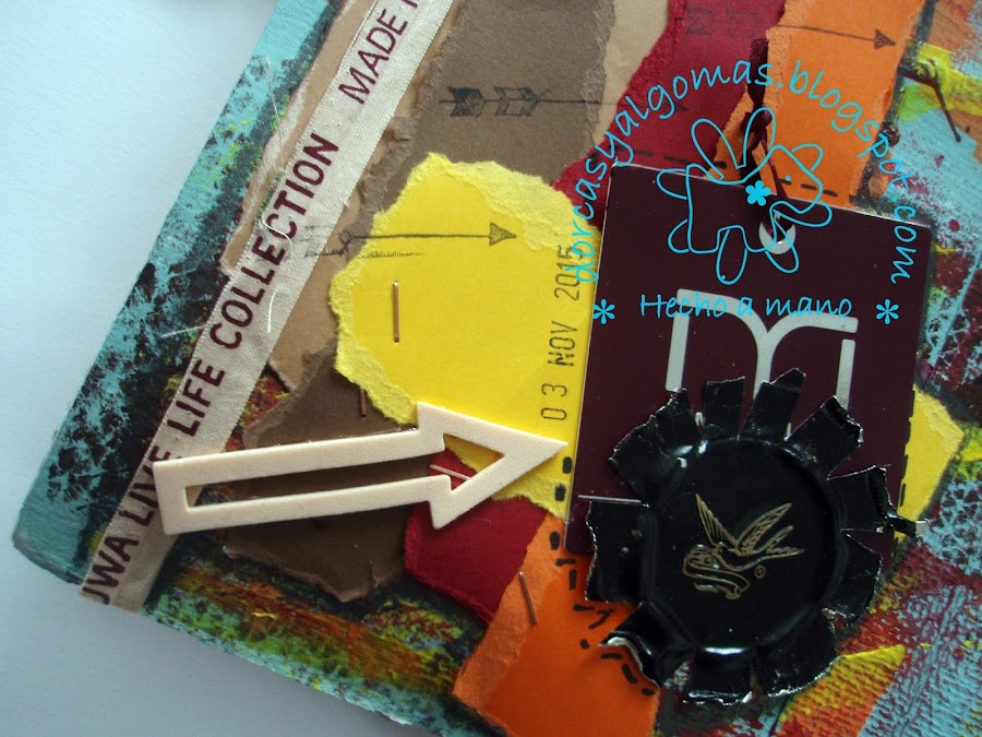 Os dejo con los detalles finales, para ello he jugado con recortes de cartulinas rasgados a mano de los colores de la paleta.He usado también grapas. Y una vez pegados los elementos decorativos, los he perfilado con grafito y el difumino.