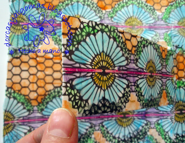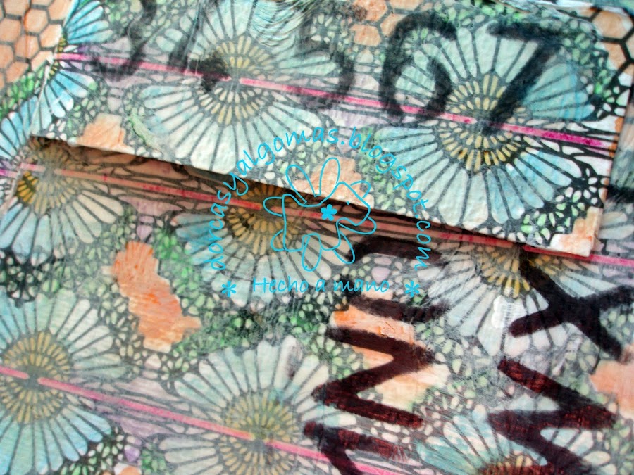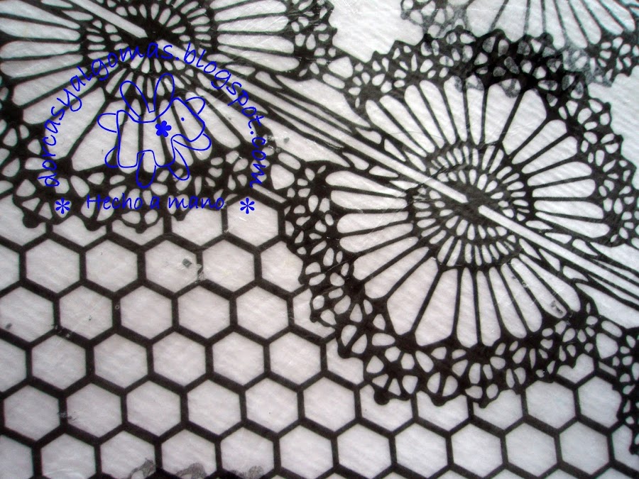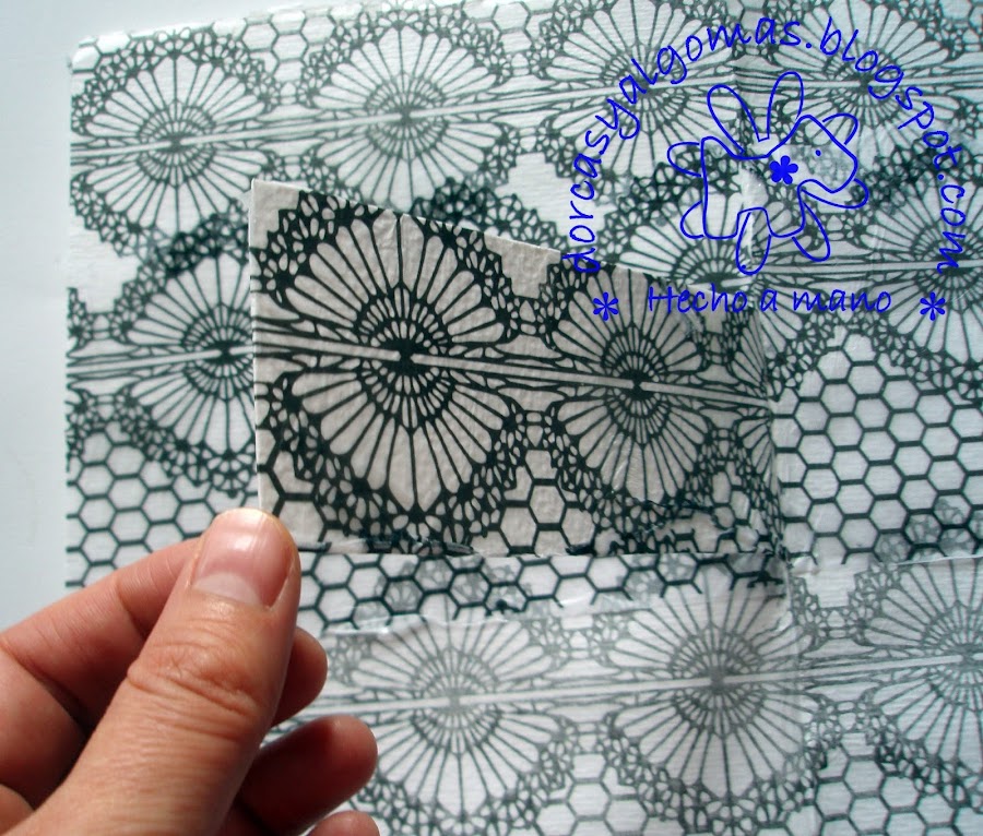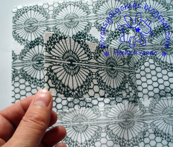 Lo primero que he hecho es pegar con cola blanca un papel de seda decorado. Lo he rescatado de una caja de zapatos.