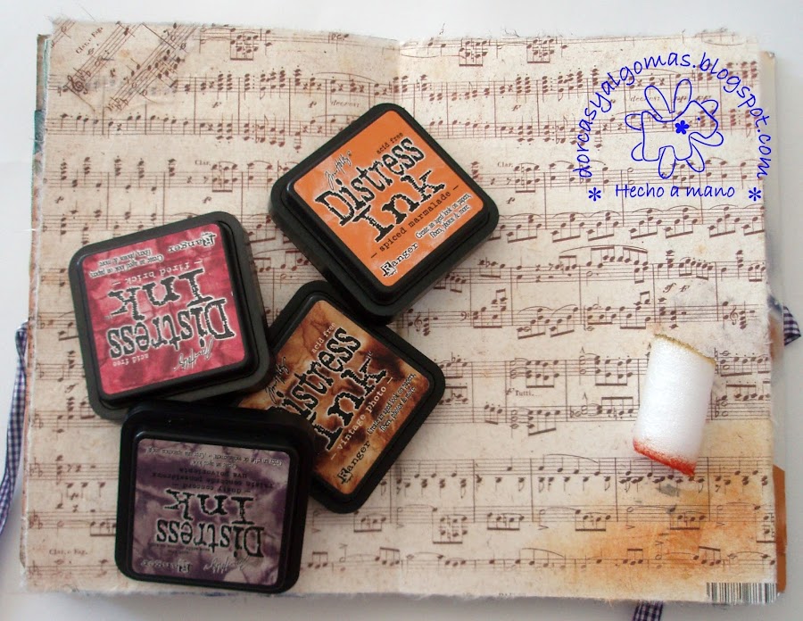 Luego he pintado con las tintas Distress, mezclando distintos colores y con la ayuda de una esponjilla.