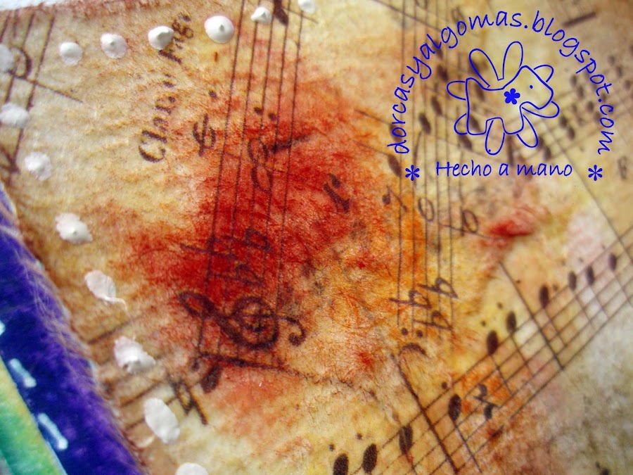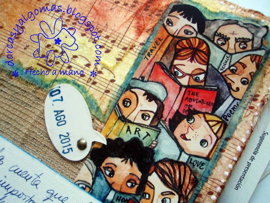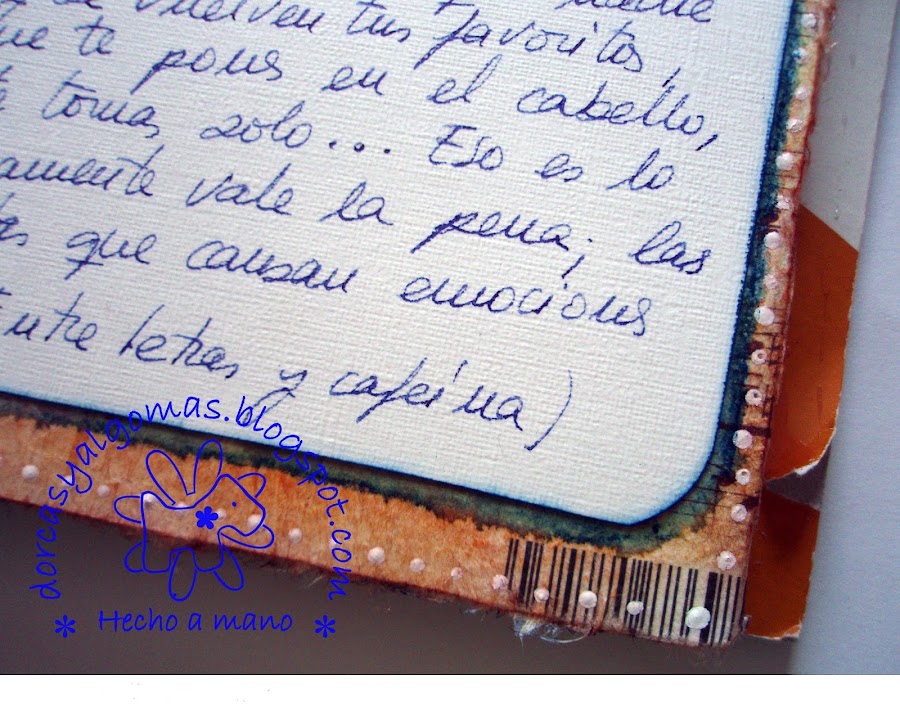 Ahora unas fotografías con la composición. Todos los detalles los he perfilado con lápiz de acuarela, el cual he difuminado con un pincel de agua. Y con un buril y pintura acrílica blanca, he punteado todo el borde de la página.