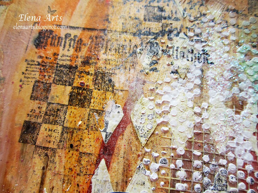 In the creation of this background, I have used an old newspaper, modelling paste with templates, gesso, diffrent paints, stamps, etc.