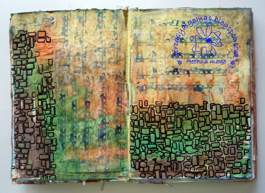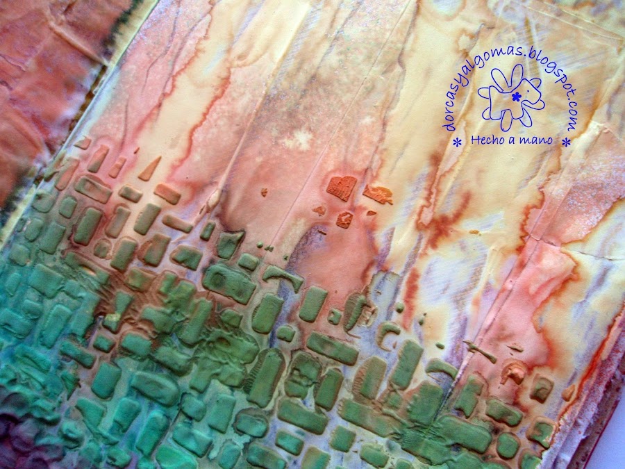 Luego jugué con tintas en spray de los siguientes colores: marrón, verde, naranja y amarillo.Podéis apreciar el efecto sobre el Gesso y sobre la pasta de modelar.
