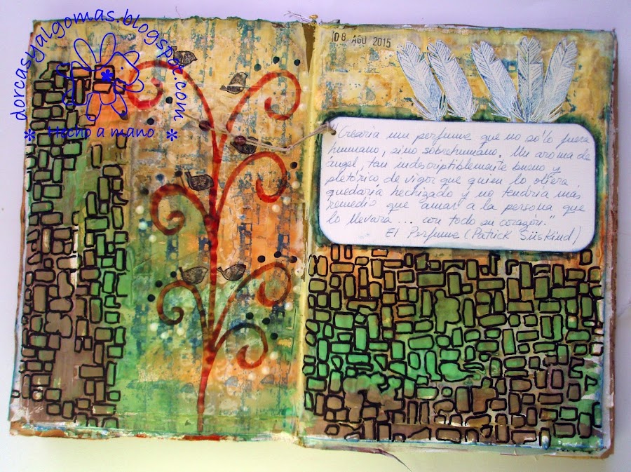 Luego con un plástico de burbujas y pintura acrílica blanca estampé por las partes de la página donde no hay stencil (apenas se aprecia en la fotografía). También con tinta azul y un sello , hice lo mismo.