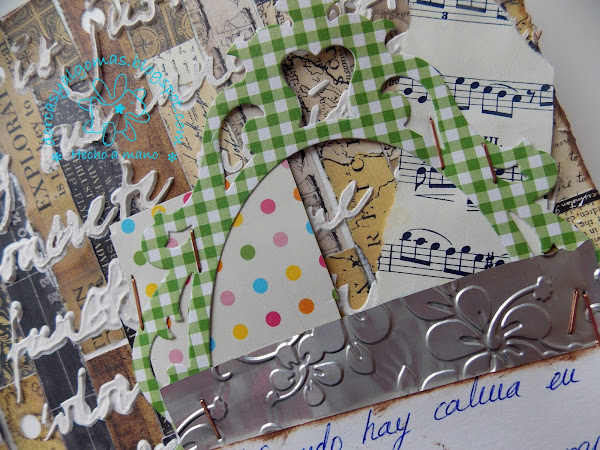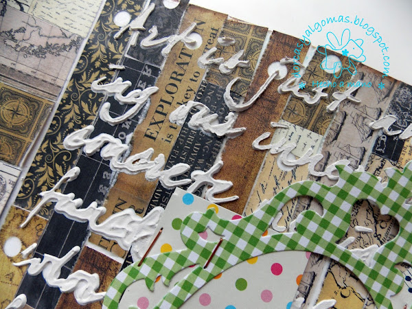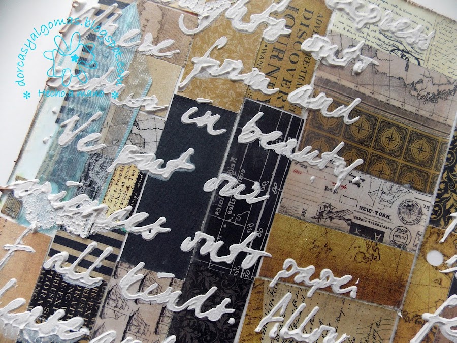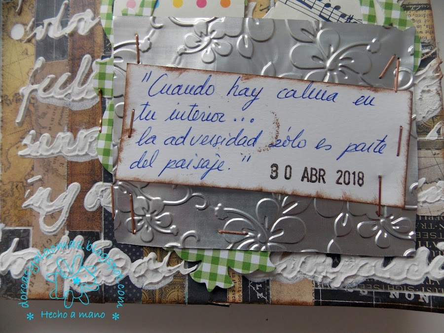 He pegado tiras de papel de scrap, son restos de una serie de tarjetas, las he pegado con gel mediúm transparente. Una vez seco , he marcado una plantilla de stencil de escritura y ha a continuación he compuesto la decoración con la frase inspiradora uniendo con grapas todas las partes.