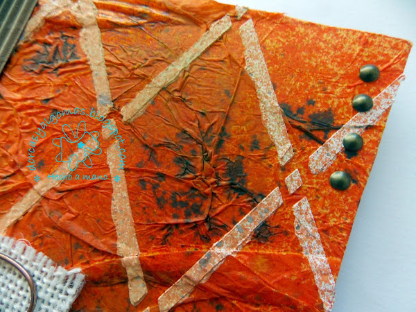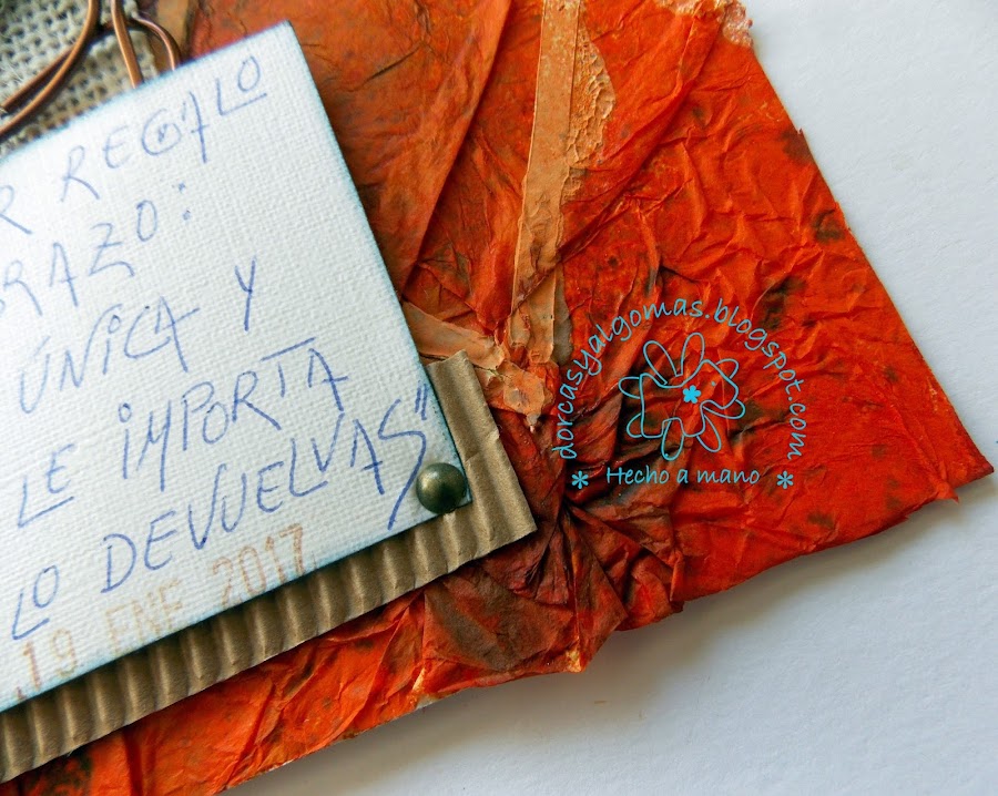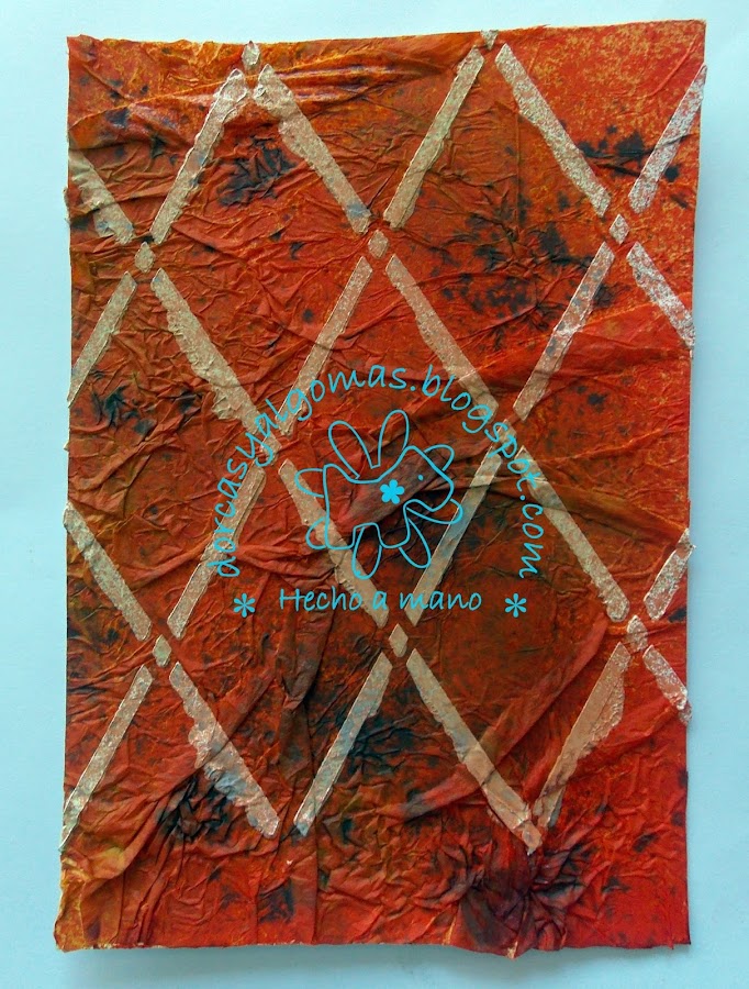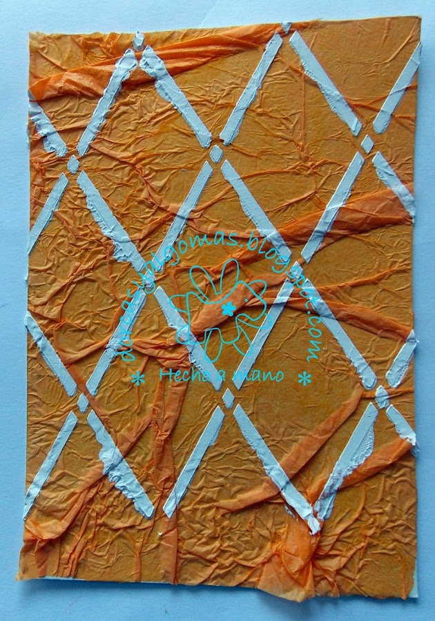 Lo primero que hago es pegar papel de seda de color naranja que previamente he arrugado. Consigo dos cosas con este paso: primero crear textura con las arrugas del papel y segundo dar color con el papel de seda naranja.
