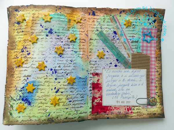 Os traigo una página de Art Journal titulada "Es mucho más difícil". Con esta página participo en la actividad "10 meses, 10 páginas" del grupo Art Journal Creativo España de Facebook para el mes de noviembre. Hay que realizar una página con el tema "El Principito" y como requisito utilizar acuarelas.