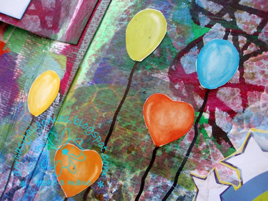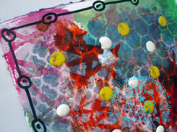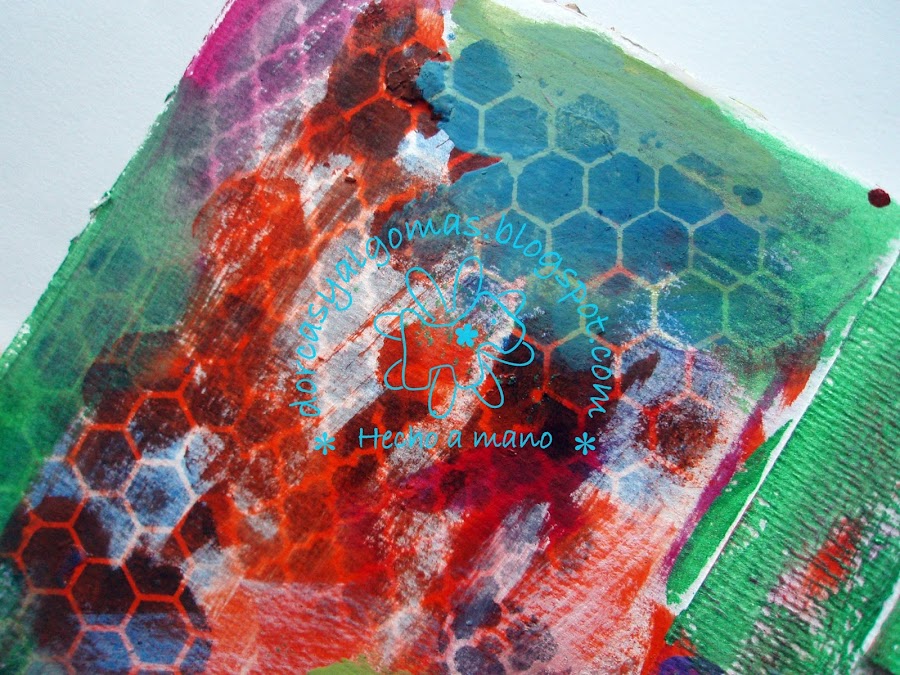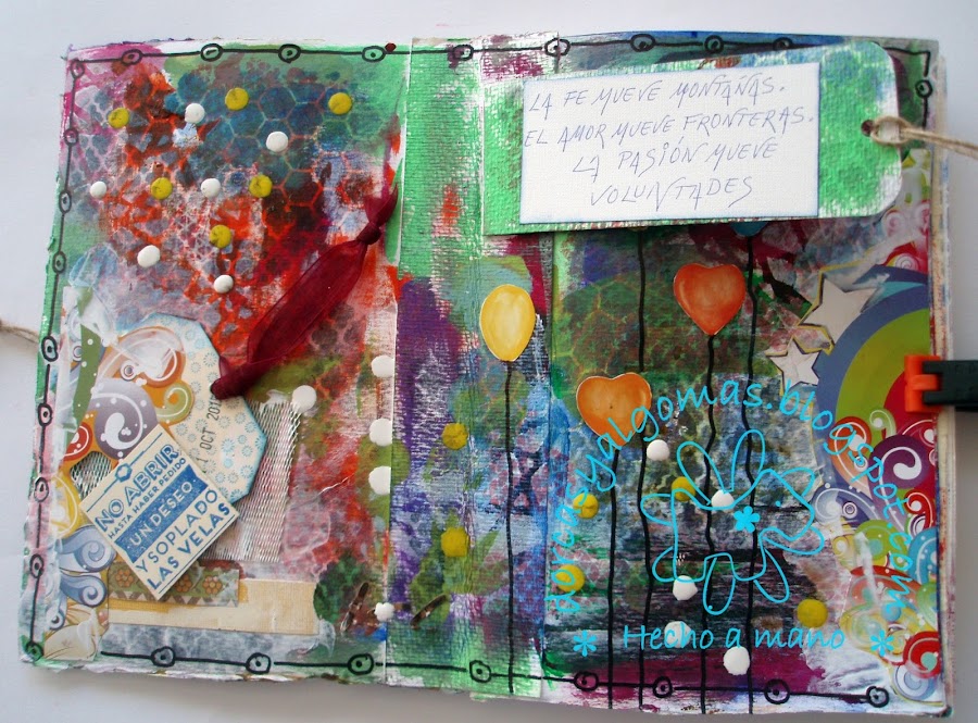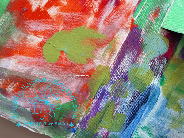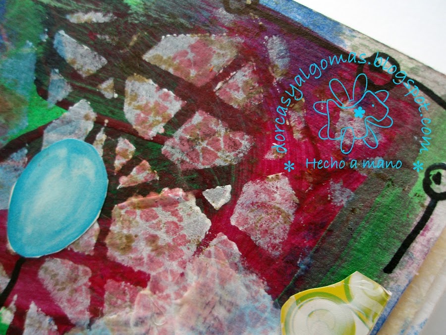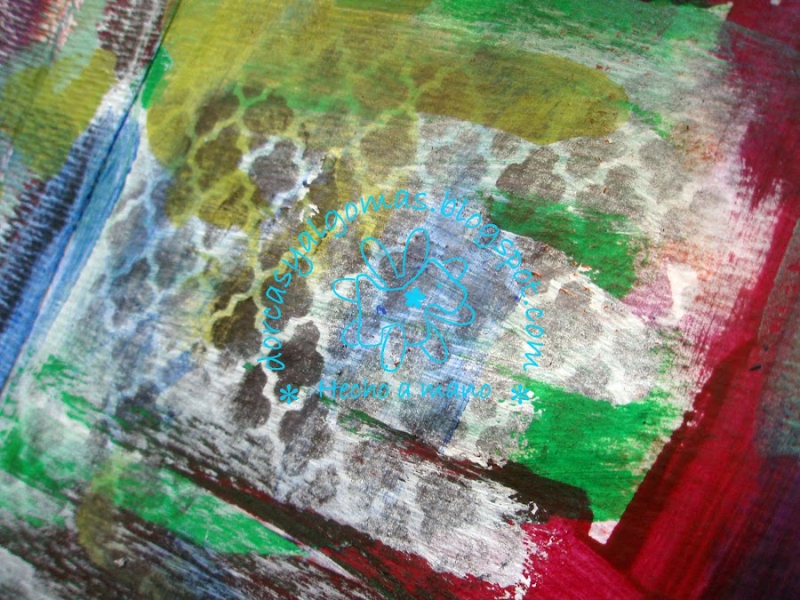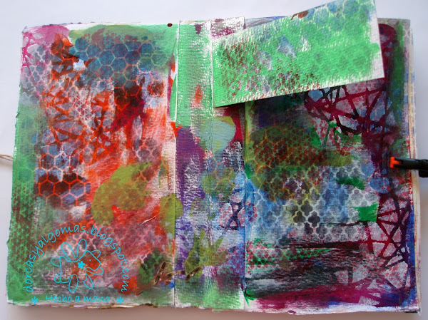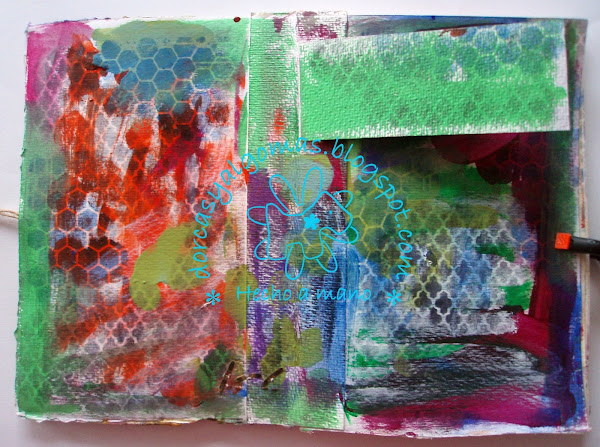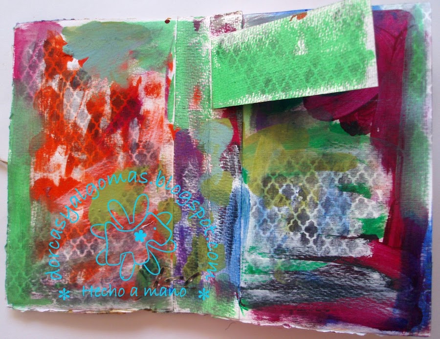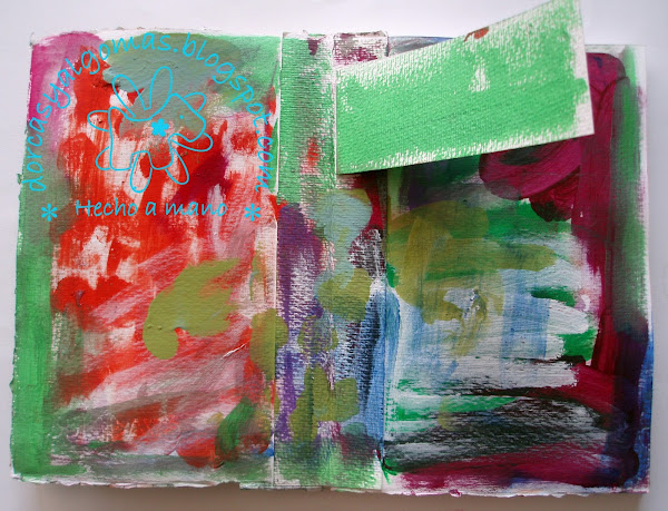 La primera capa de esta página está realizada con la pintura que sobra en los pinceles. La verdad es que es una buena manera de aprovechar la pintura que queda en el pincel antes de limpiarlo, descargando sobre una página en blanco. Se crean fondos muy lindos y muy coloridos. como muestra un botón: