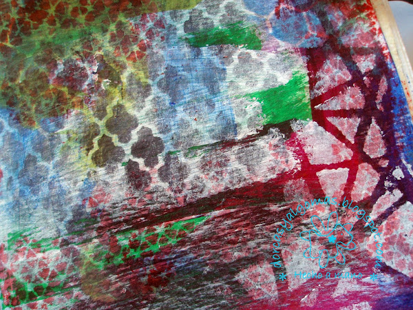Esta vez no he matizado el fondo con gesso pues quiero jugar con los colores. He aplicado tinta negra, azul, verde y por último de color blanco para iluminar sobre plantillas de stencil: