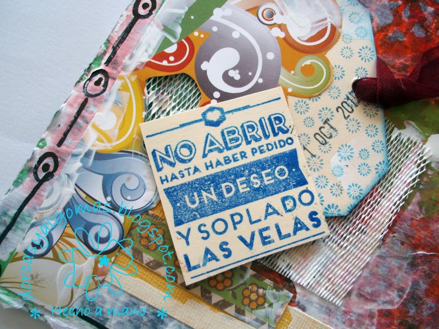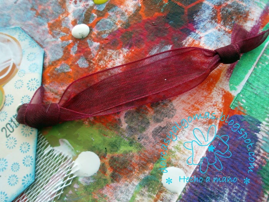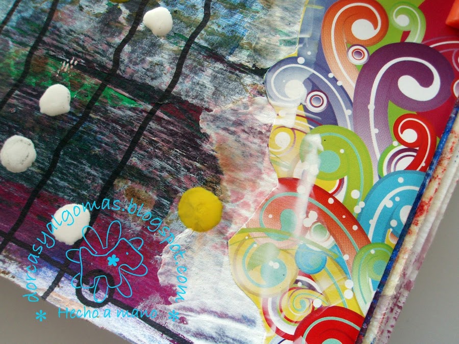 En la decoración he integrado parte de los elementos decorativos con el fondo, con la ayuda del Gesso y he puesto algunas gotas de pintura de cera caliente para dar volumen.