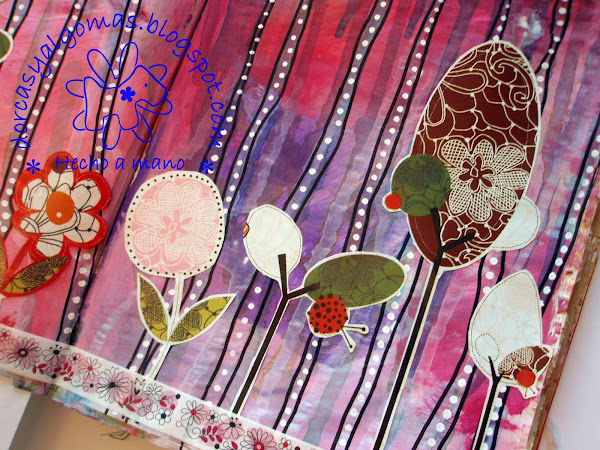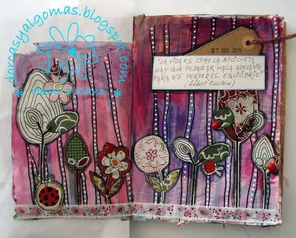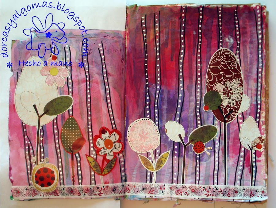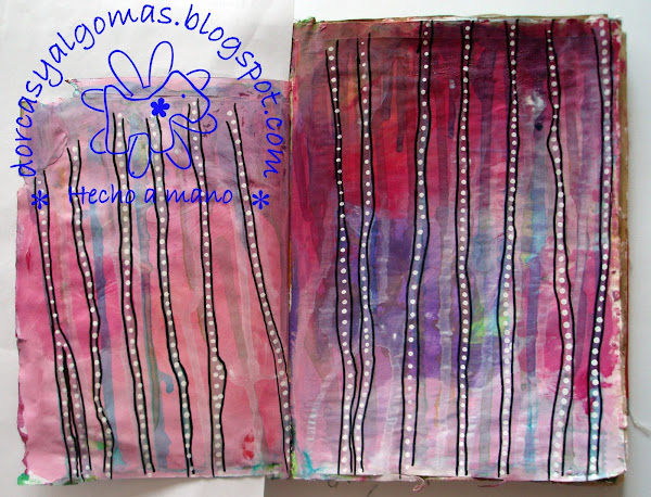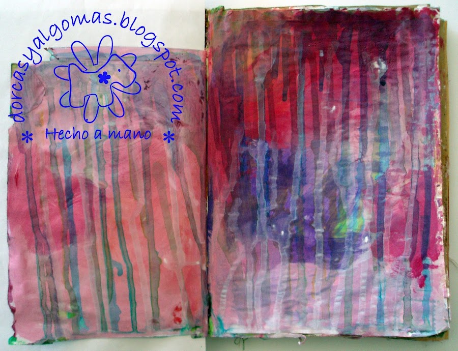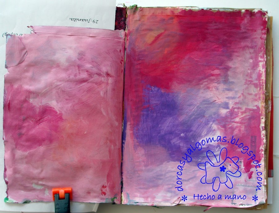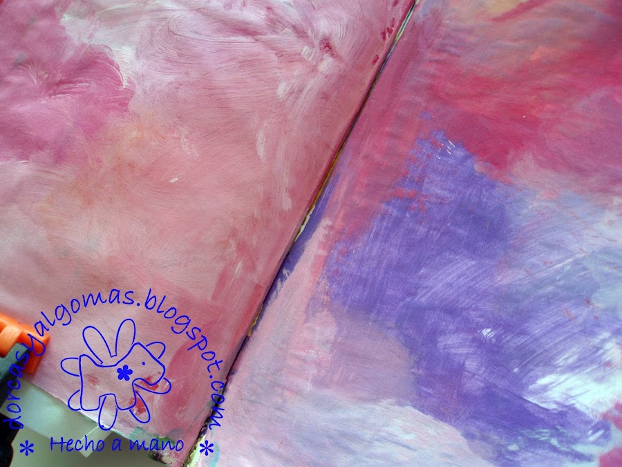 Lo primero es dar una capa de Gesso por toda la página y a continuación he pintado con los dedos con pinturas acrílicas en tonos morados, rosas y blanco.