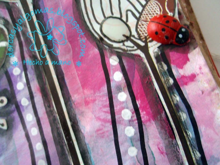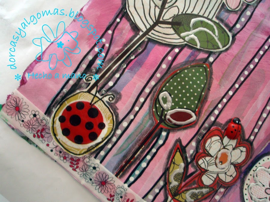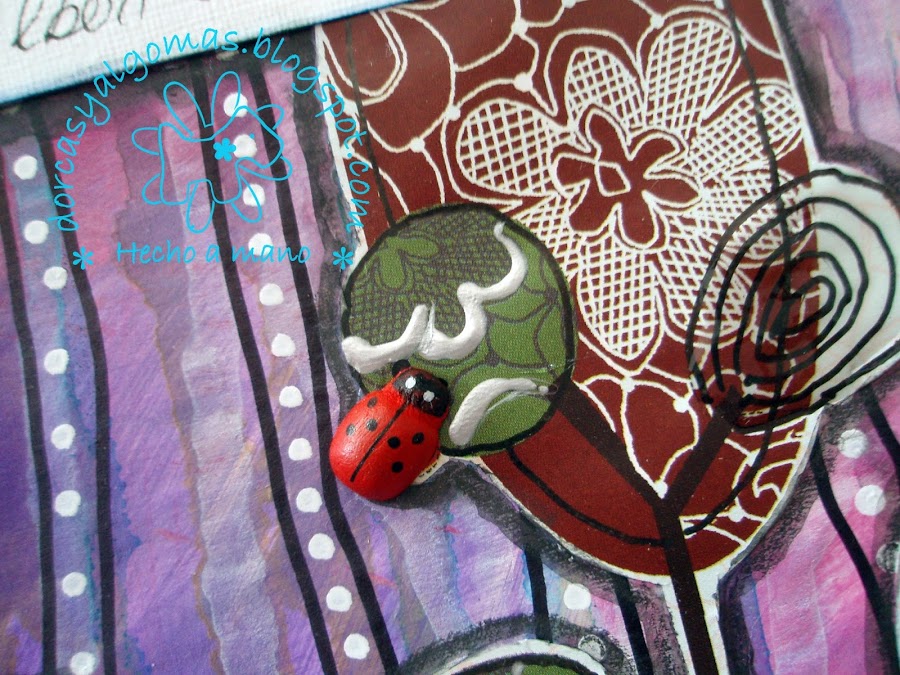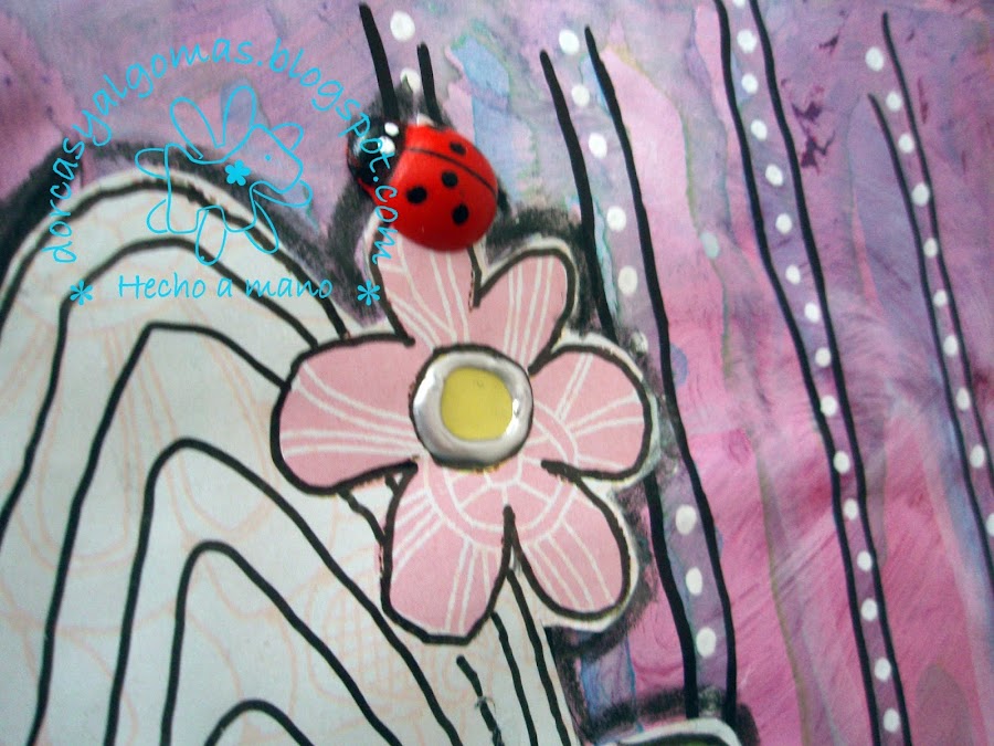 Y ya está el fondo, vamos con la decoración. También como punto final he utilizado Liquid Pearls plateado para resaltar algunos detalles de las flores y he puesto algunas mariquitas de madera.