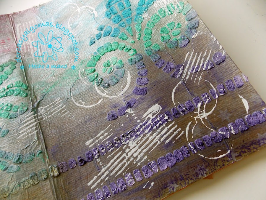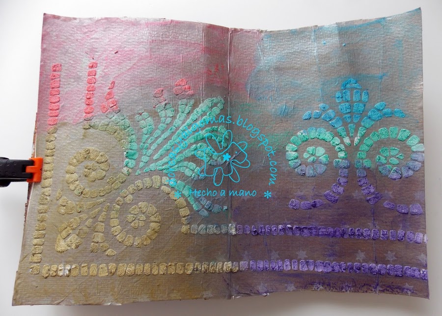 Dejo secar. Con un tubo y un trozo de cartón corrugado, hago estampaciones por toda la hoja con pintura acrílica blanca.