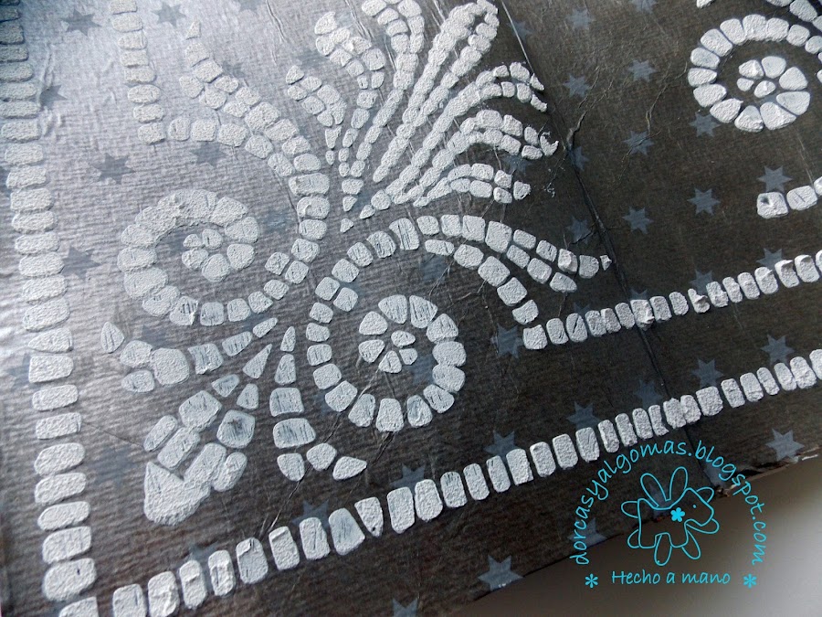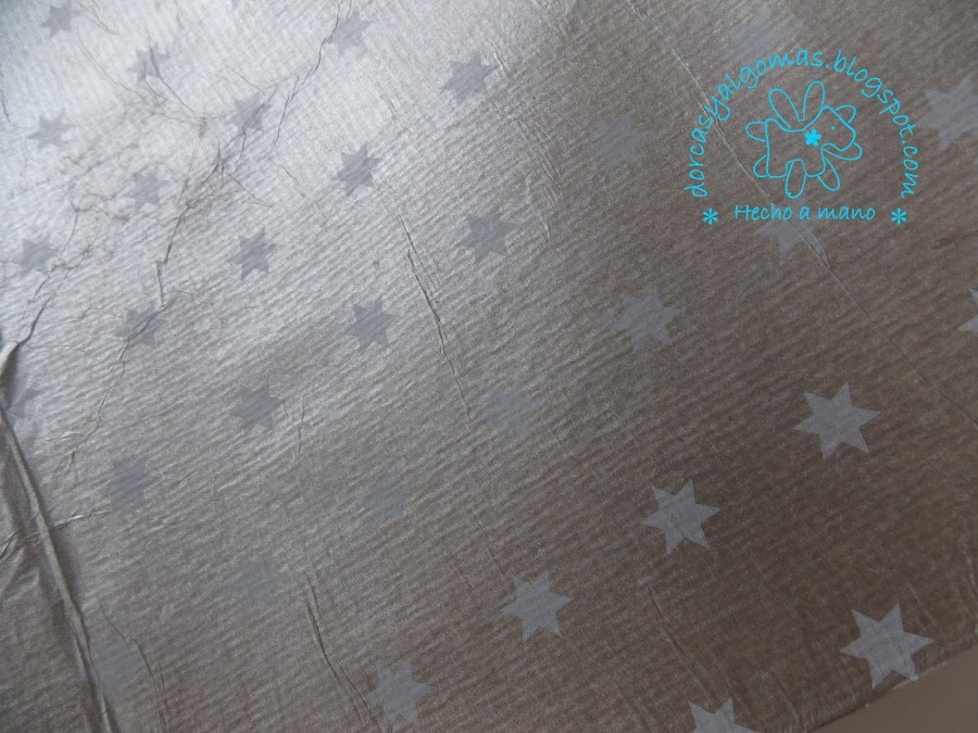 Lo primero es pegar un papel de regalo de color plata con estrellas, para ello he utilizado el gel médium.
