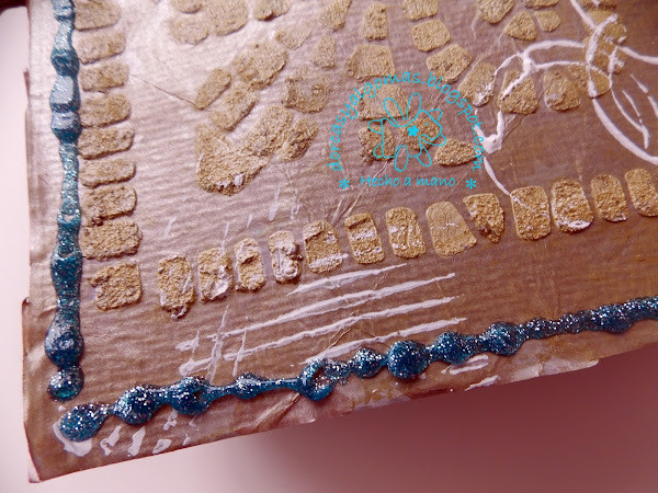 En dos esquinas opuestas pongo purpurina azul con pegamento.