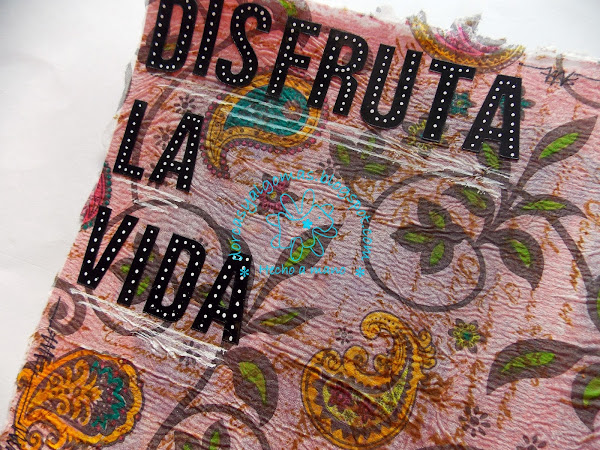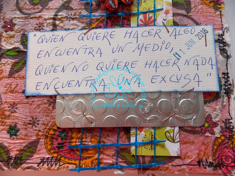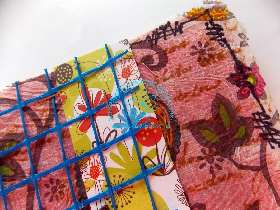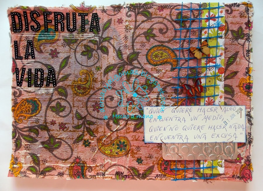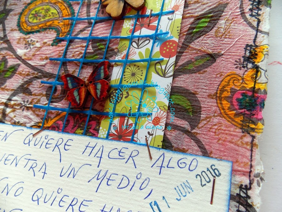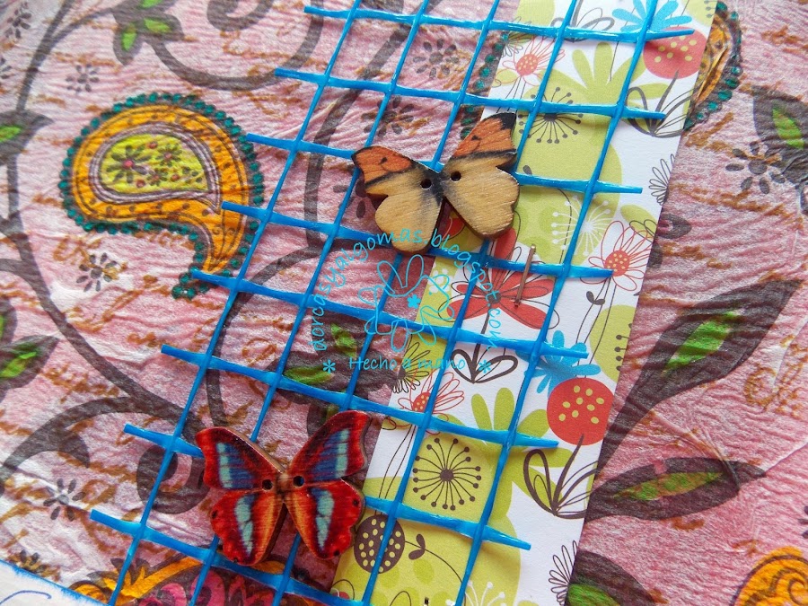 Fondo listo y ahora la decoración, he utilizado restos de materiales como papel de scrap, grapas, unas mariposas de madera, un blister de medicinas que he pasado por la Big Shot, un trozo de red azul.